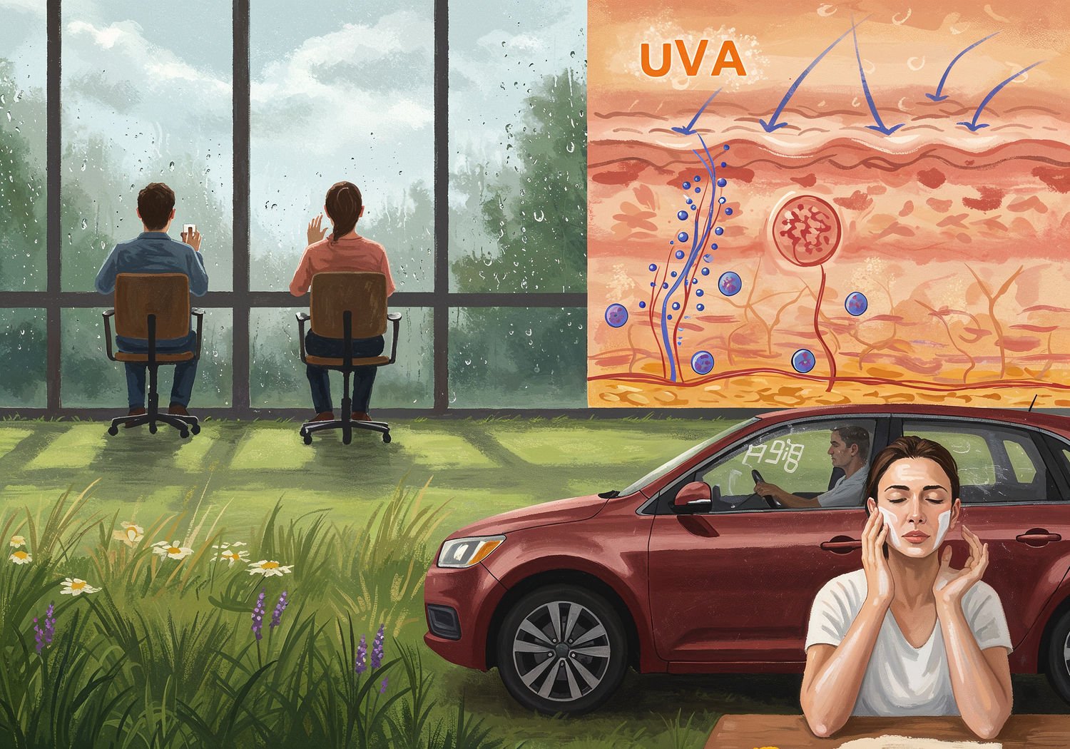 Impressionist painting, plein air, vibrant colors, capturing the moment, flickering light, visible short brush strokes, broken color technique, soft focus Impressionist painting, plein air, vibrant colors, capturing the moment, flickering light, visible short brush strokes, broken color technique, soft focus A diverse group of people in everyday settings: one sitting by a large office window on a cloudy rainy day with UVA rays depicted as subtle invisible waves penetrating through thick clouds, raindrops, and glass to reach their exposed skin; another driving a car with UVA passing through the windshield onto their face and hands; a third applying broad-spectrum sunscreen to their face indoors near a desk; in the background, cross-section of skin layers showing UVA damaging collagen and elastin fibers leading to wrinkles, contrasted with protected skin remaining smooth and youthful. ;Image without icons or texts. Style: Oil painting on canvas, impasto texture, thick layers of paint, high-key lighting, atmosphere of a hazy morning; ;Image without icons or texts. Style: Oil painting on canvas, impasto texture, thick layers of paint, high-key lighting, atmosphere of a hazy morning;