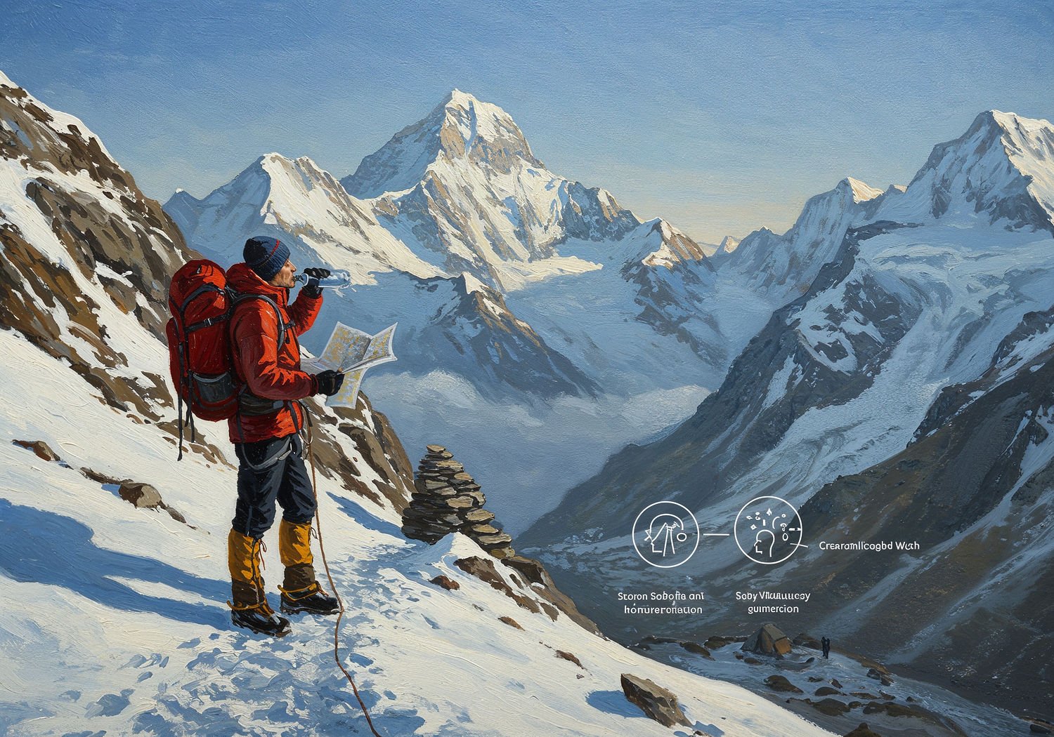 Impressionist painting, plein air, vibrant colors, capturing the moment, flickering light, visible short brush strokes, broken color technique, soft focus Impressionist painting, plein air, vibrant colors, capturing the moment, flickering light, visible short brush strokes, broken color technique, soft focus A mountaineer carefully ascending a steep snowy mountain path during the day, pausing to drink from a water bottle while checking a map, with a lower campsite visible below for nighttime rest, surrounded by high-altitude rocky peaks and thin air, a small pill bottle in hand symbolizing medication, and faint icons nearby showing a headache, fatigue, and balanced breathing to represent symptoms and safe acclimatization. ;Image without icons or texts. Style: Oil painting on canvas, impasto texture, thick layers of paint, high-key lighting, atmosphere of a hazy morning; ;Image without icons or texts. Style: Oil painting on canvas, impasto texture, thick layers of paint, high-key lighting, atmosphere of a hazy morning;