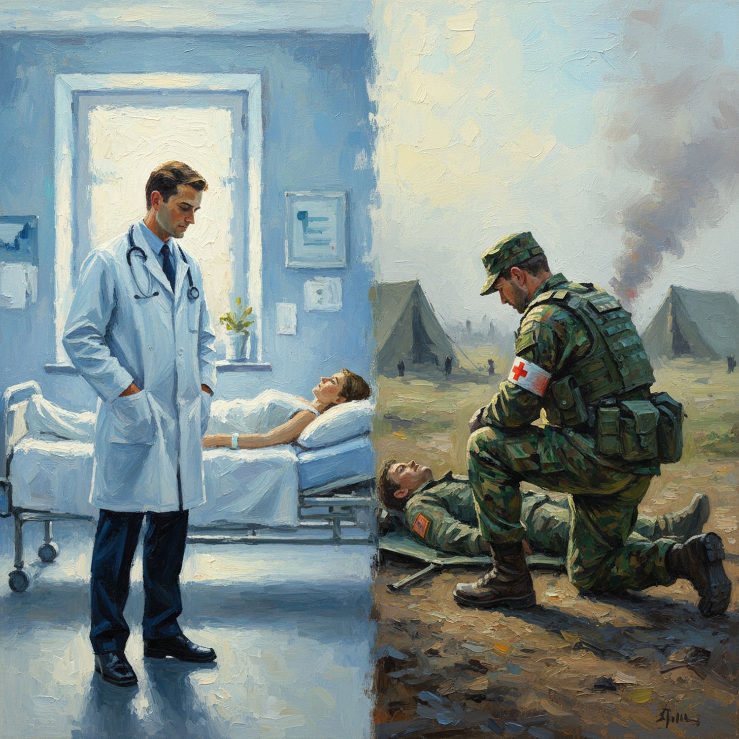 Impressionist painting, plein air, vibrant colors, capturing the moment, flickering light, visible short brush strokes, broken color technique, soft focus Impressionist painting, plein air, vibrant colors, capturing the moment, flickering light, visible short brush strokes, broken color technique, soft focus A split composition showing a civilian doctor in a white lab coat with stethoscope and pockets, standing in a clean hospital room treating a patient on a bed, contrasted on the other side with a military medic in camouflage uniform with Red Cross armband, Kevlar reinforcements, and attached medical pouches, kneeling to aid an injured soldier in a rugged battlefield with tents and smoke in the background. ;Image without icons or texts. Style: Oil painting on canvas, impasto texture, thick layers of paint, high-key lighting, atmosphere of a hazy morning; ;Image without icons or texts. Style: Oil painting on canvas, impasto texture, thick layers of paint, high-key lighting, atmosphere of a hazy morning;