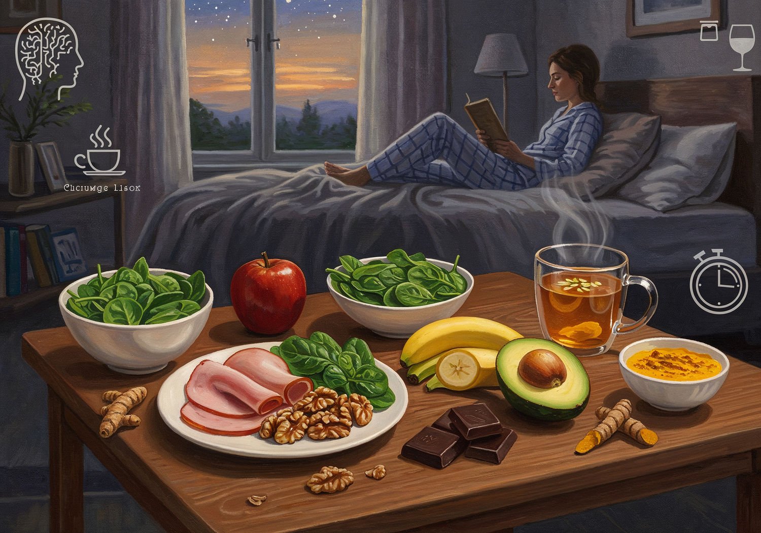 Impressionist painting, plein air, vibrant colors, capturing the moment, flickering light, visible short brush strokes, broken color technique, soft focus Impressionist painting, plein air, vibrant colors, capturing the moment, flickering light, visible short brush strokes, broken color technique, soft focus A serene evening bedroom scene with a wooden table holding a plate of sliced turkey, banana, walnuts, spinach salad, avocado, dark chocolate pieces, a bowl of cherries, and a cup of steaming chamomile tea next to a glass of warm milk with turmeric. In the background, a cozy bed with soft pillows under a starry night sky visible through an open window, a person in pajamas sitting relaxed on the bed reading a book, with subtle icons of a brain emitting calming waves and a clock showing bedtime, while faint crossed-out symbols of coffee cup and wine glass float in the corner. ;Image without icons or texts. Style: Oil painting on canvas, impasto texture, thick layers of paint, high-key lighting, atmosphere of a hazy morning; ;Image without icons or texts. Style: Oil painting on canvas, impasto texture, thick layers of paint, high-key lighting, atmosphere of a hazy morning;