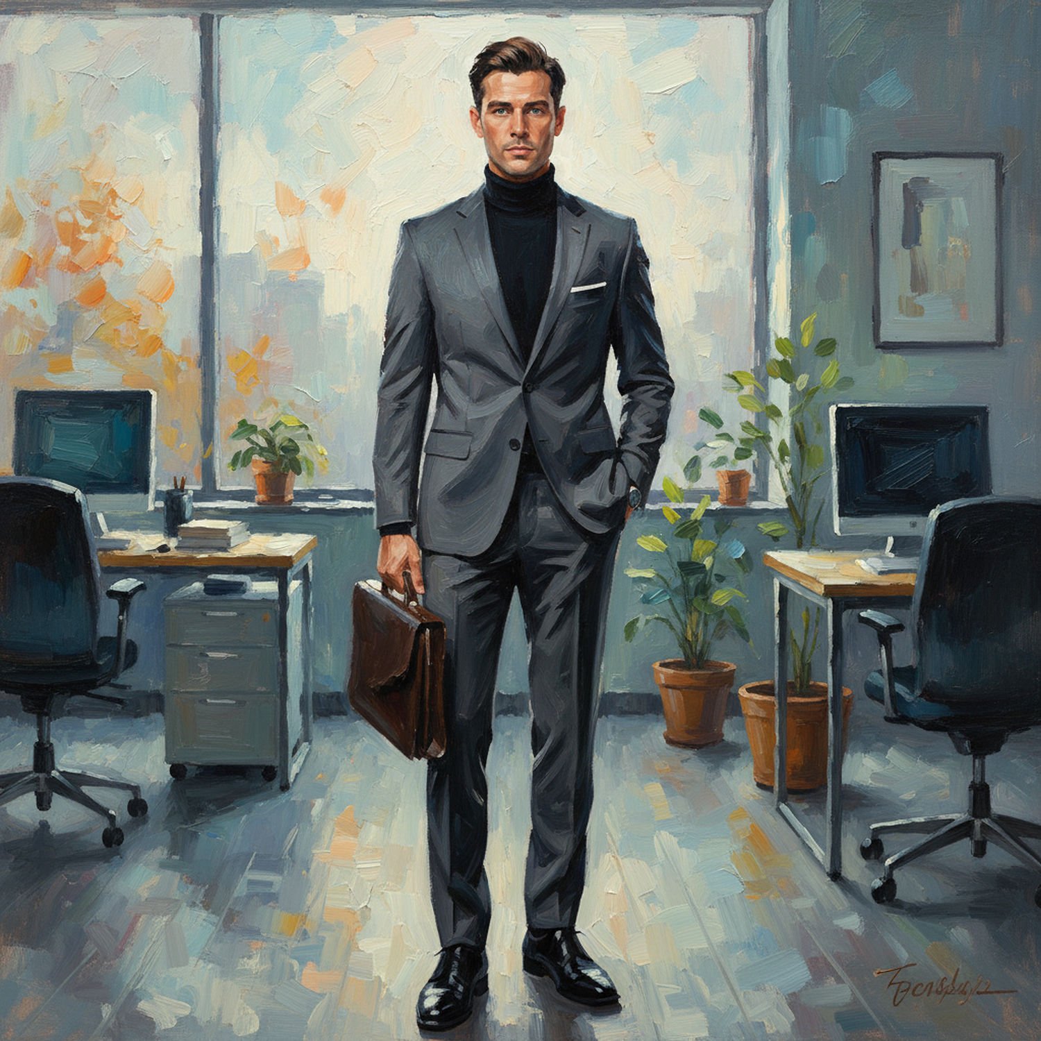 Impressionist painting, plein air, vibrant colors, capturing the moment, flickering light, visible short brush strokes, broken color technique, soft focus Impressionist painting, plein air, vibrant colors, capturing the moment, flickering light, visible short brush strokes, broken color technique, soft focus A professional man standing confidently in a modern office, wearing a slim-fit graphite gray suit with a narrow-lapel single-breasted jacket, a high-neck black turtleneck sweater underneath, straight-leg trousers, and polished black leather oxford shoes, holding a briefcase, with a subtle cool autumn light filtering through a window behind him. ;Image without icons or texts. Style: Oil painting on canvas, impasto texture, thick layers of paint, high-key lighting, atmosphere of a hazy morning; ;Image without icons or texts. Style: Oil painting on canvas, impasto texture, thick layers of paint, high-key lighting, atmosphere of a hazy morning;