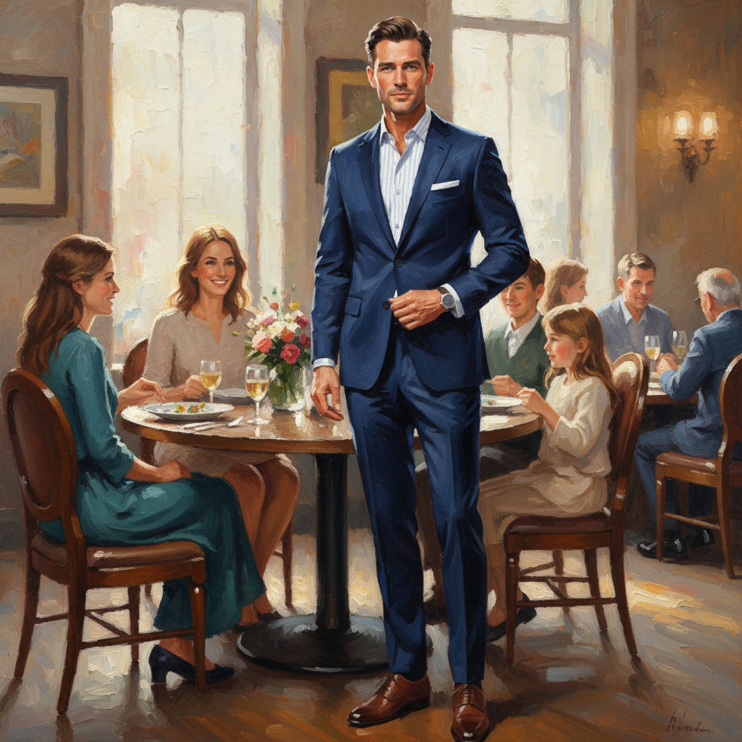 Impressionist painting, plein air, vibrant colors, capturing the moment, flickering light, visible short brush strokes, broken color technique, soft focus Impressionist painting, plein air, vibrant colors, capturing the moment, flickering light, visible short brush strokes, broken color technique, soft focus A well-dressed man in a slim-fit navy blue single-breasted suit with two buttons, paired with a white dress shirt featuring subtle thin blue pinstripes, standing confidently in a cozy restaurant during an afternoon family lunch. He wears polished brown oxford shoes, a simple white pocket square in his jacket pocket, and a subtle silver watch on his wrist. The scene includes a round dining table set with plates, glasses, and a centerpiece, surrounded by smiling family members including a woman and two children, with warm natural light filtering through windows. ;Image without icons or texts. Style: Oil painting on canvas, impasto texture, thick layers of paint, high-key lighting, atmosphere of a hazy morning; ;Image without icons or texts. Style: Oil painting on canvas, impasto texture, thick layers of paint, high-key lighting, atmosphere of a hazy morning;