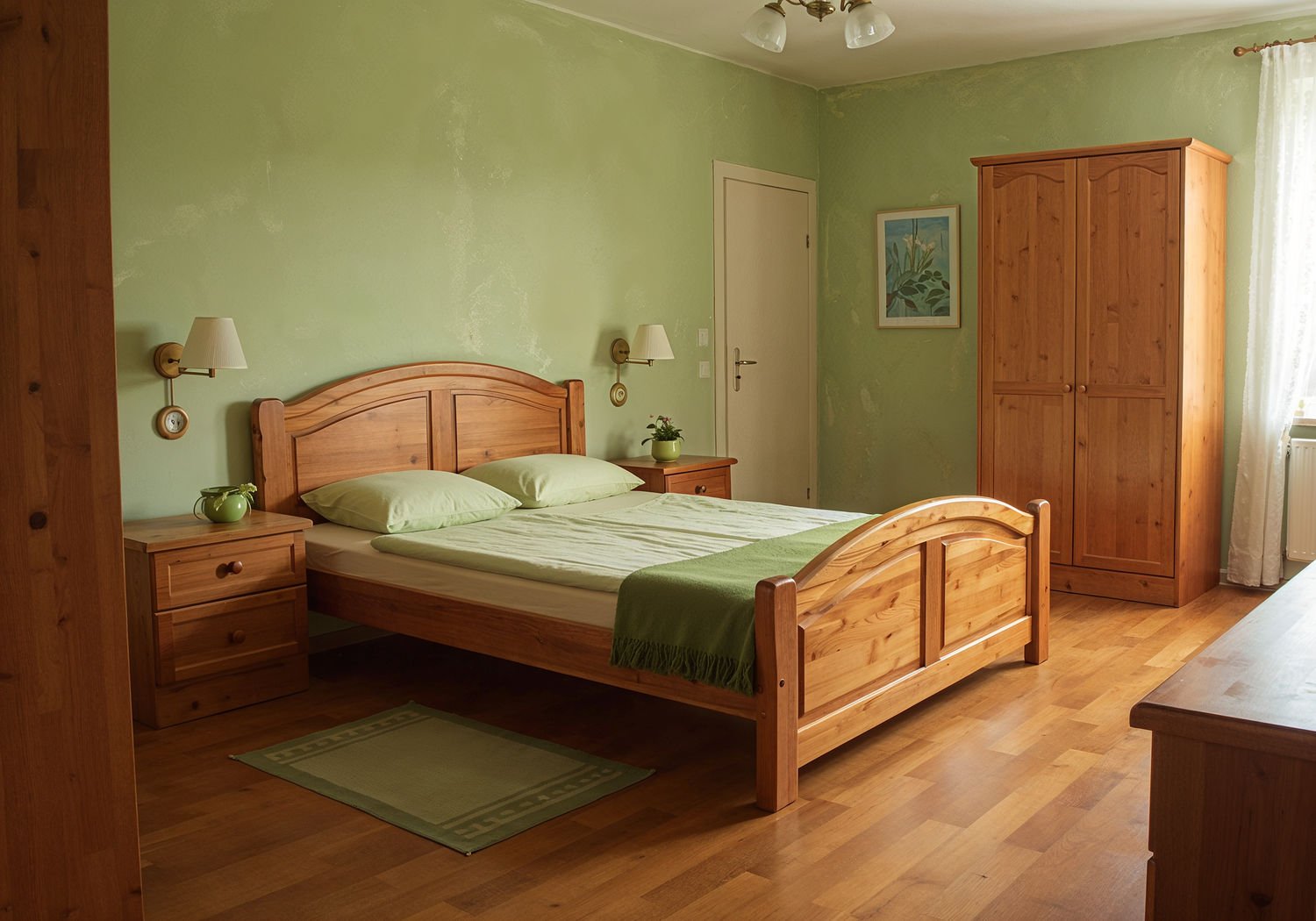 Impressionist painting, plein air, vibrant colors, capturing the moment, flickering light, visible short brush strokes, broken color technique, soft focus Impressionist painting, plein air, vibrant colors, capturing the moment, flickering light, visible short brush strokes, broken color technique, soft focus A serene bedroom interior arranged according to Feng Shui principles, featuring a large wooden bed positioned diagonally against a solid wall with a clear view of the closed entrance door but not directly in line with it, headboard providing support and feet not pointing toward the door; symmetrical nightstands on both sides with drawers closed and minimal items; no mirrors visible reflecting the bed; soft earth-toned walls in beige and green hues; a closed door to an adjacent bathroom; light wooden dresser placed away from the bed with at least 45 cm clearance for easy movement; no electronics or heavy furniture overhead; subtle natural light filtering through curtains on a window not above the bed; overall harmonious and uncluttered space evoking security and relaxation. ;Image without icons or texts. Style: Oil painting on canvas, impasto texture, thick layers of paint, high-key lighting, atmosphere of a hazy morning; ;Image without icons or texts. Style: Oil painting on canvas, impasto texture, thick layers of paint, high-key lighting, atmosphere of a hazy morning;