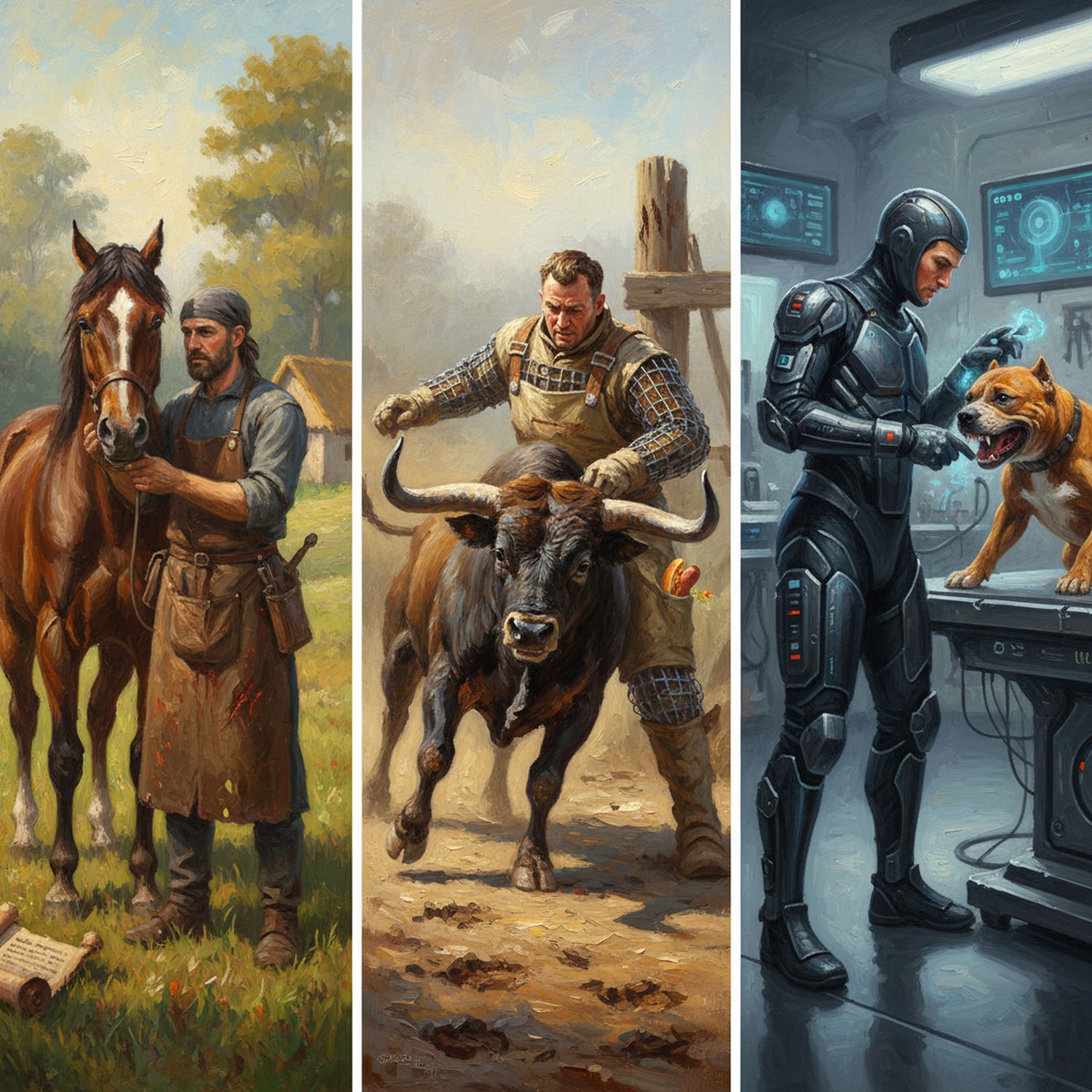 Impressionist painting, plein air, vibrant colors, capturing the moment, flickering light, visible short brush strokes, broken color technique, soft focus Impressionist painting, plein air, vibrant colors, capturing the moment, flickering light, visible short brush strokes, broken color technique, soft focus A split-panel illustration depicting the evolution of veterinary protective clothing: on the left, a medieval veterinarian in a simple leather apron treating a horse in a rural field, with scratches and blood on the apron; in the center, a 20th-century vet in a canvas suit reinforced with steel mesh handling an aggressive bull on a farm; on the right, a modern veterinarian in a full Kevlar jumpsuit with modular panels examining a snarling pit bull dog in a clinic, surrounded by high-tech tools like sensors and antibacterial layers; subtle background elements include historical texts, animal bites marks, and humorous details like a torn apron piece or a hot dog spilling from a pocket. ;Image without icons or texts. Style: Oil painting on canvas, impasto texture, thick layers of paint, high-key lighting, atmosphere of a hazy morning; ;Image without icons or texts. Style: Oil painting on canvas, impasto texture, thick layers of paint, high-key lighting, atmosphere of a hazy morning;