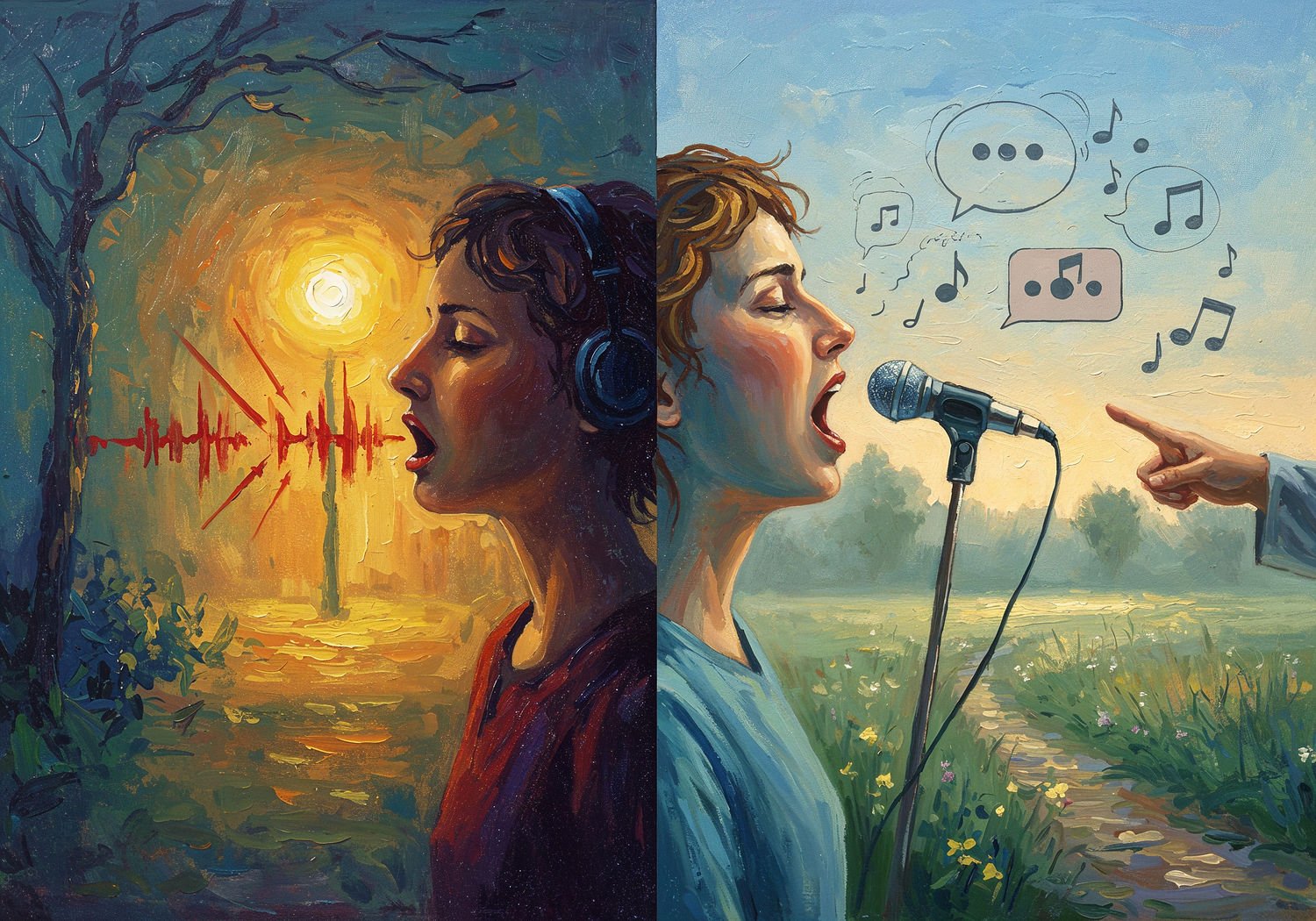 Impressionist painting, plein air, vibrant colors, capturing the moment, flickering light, visible short brush strokes, broken color technique, soft focus Impressionist painting, plein air, vibrant colors, capturing the moment, flickering light, visible short brush strokes, broken color technique, soft focus A person with a speech impediment transforming through voice therapy: on the left side, they appear frustrated and isolated with a blocked mouth and jagged sound waves; on the right, they sing confidently with flowing musical notes and smooth speech bubbles emerging, symbolizing fluency and emotional freedom, surrounded by subtle brain connections and a therapist guiding with a hand gesture. ;Image without icons or texts. Style: Oil painting on canvas, impasto texture, thick layers of paint, high-key lighting, atmosphere of a hazy morning; ;Image without icons or texts. Style: Oil painting on canvas, impasto texture, thick layers of paint, high-key lighting, atmosphere of a hazy morning;