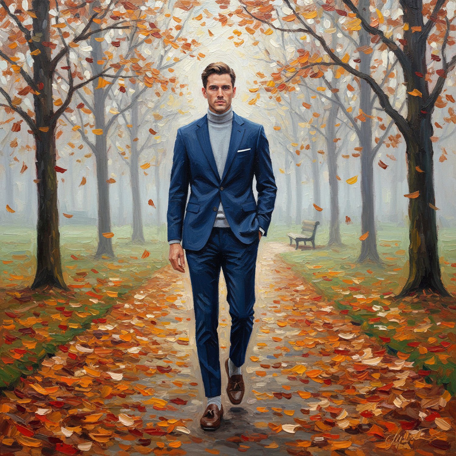 Impressionist painting, plein air, vibrant colors, capturing the moment, flickering light, visible short brush strokes, broken color technique, soft focus Impressionist painting, plein air, vibrant colors, capturing the moment, flickering light, visible short brush strokes, broken color technique, soft focus A man in a slim-fit navy blue suit jacket and trousers, wearing a light gray turtleneck sweater underneath, paired with brown leather loafers and wool socks, strolling relaxed on a leaf-strewn park path during a cool autumn day, surrounded by trees with falling orange and red leaves, misty air, and a distant park bench. ;Image without icons or texts. Style: Oil painting on canvas, impasto texture, thick layers of paint, high-key lighting, atmosphere of a hazy morning; ;Image without icons or texts. Style: Oil painting on canvas, impasto texture, thick layers of paint, high-key lighting, atmosphere of a hazy morning;