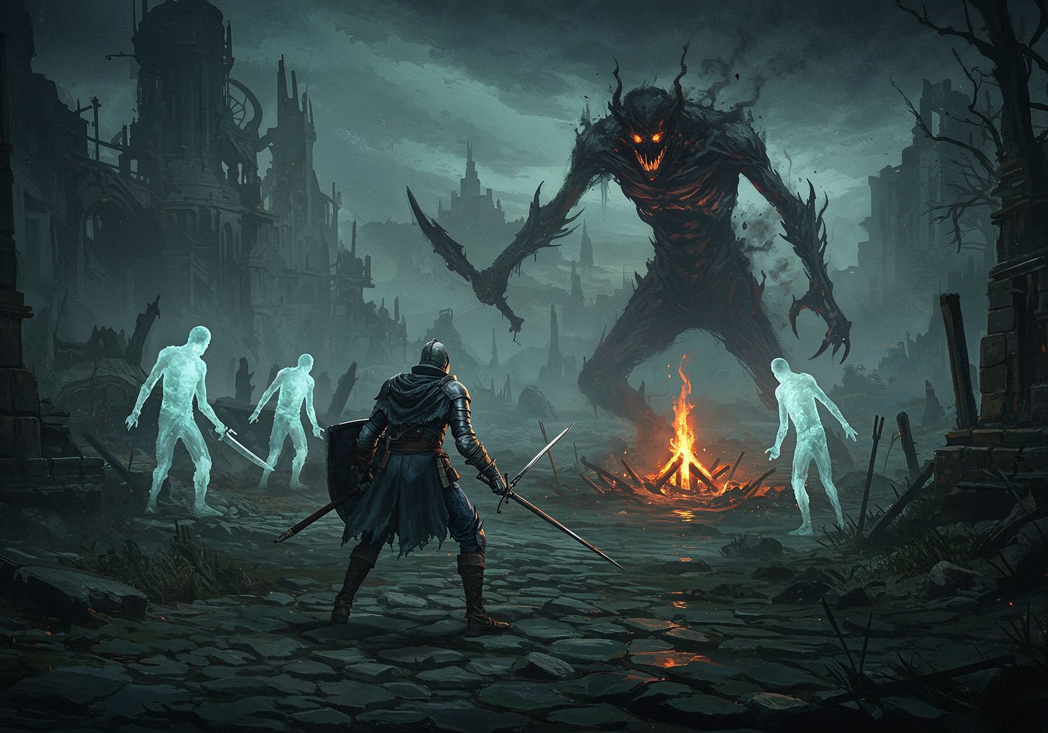 Impressionist painting, plein air, vibrant colors, capturing the moment, flickering light, visible short brush strokes, broken color technique, soft focus Impressionist painting, plein air, vibrant colors, capturing the moment, flickering light, visible short brush strokes, broken color technique, soft focus A lone armored warrior stands defiantly in a dark, ruined medieval landscape, facing a massive, shadowy boss monster with glowing eyes and jagged weapons, mid-swing in combat. Scattered around the warrior are ethereal ghosts of previous failed attempts, showing the same figure dying in various poses from the boss’s attacks, while a bonfire checkpoint glows nearby, symbolizing repeated tries and resilience. In the background, faint outlines of explored ruins and traps highlight the perilous journey. ;Image without icons or texts. Style: Oil painting on canvas, impasto texture, thick layers of paint, high-key lighting, atmosphere of a hazy morning; ;Image without icons or texts. Style: Oil painting on canvas, impasto texture, thick layers of paint, high-key lighting, atmosphere of a hazy morning;
