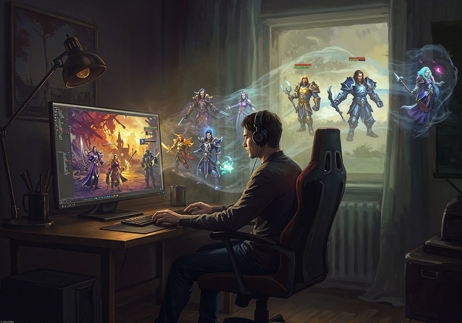 Impressionist painting, plein air, vibrant colors, capturing the moment, flickering light, visible short brush strokes, broken color technique, soft focus Impressionist painting, plein air, vibrant colors, capturing the moment, flickering light, visible short brush strokes, broken color technique, soft focus A solitary gamer sits alone in a dimly lit room at a computer desk, focused on a vibrant screen displaying a multiplayer game world like World of Warcraft, where colorful avatars of diverse players form a tight-knit guild battling a boss together; ethereal, semi-transparent figures of these virtual friends extend from the screen into the real room, surrounding the gamer with welcoming gestures, symbolizing emotional connection and support amidst physical isolation. ;Image without icons or texts. Style: Oil painting on canvas, impasto texture, thick layers of paint, high-key lighting, atmosphere of a hazy morning; ;Image without icons or texts. Style: Oil painting on canvas, impasto texture, thick layers of paint, high-key lighting, atmosphere of a hazy morning;