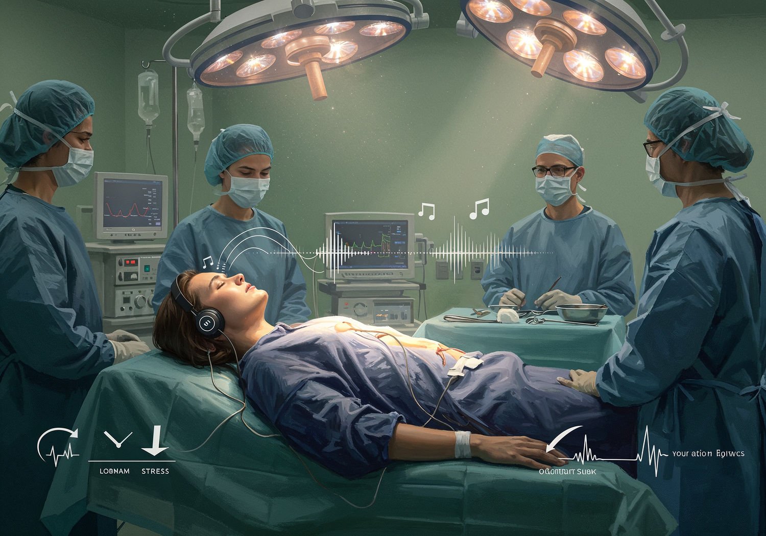 Impressionist painting, plein air, vibrant colors, capturing the moment, flickering light, visible short brush strokes, broken color technique, soft focus Impressionist painting, plein air, vibrant colors, capturing the moment, flickering light, visible short brush strokes, broken color technique, soft focus A patient lying calmly on an operating table in a sterile surgical room, wearing headphones with soft musical notes and sound waves emanating from them, surrounded by surgeons and medical equipment, with a relaxed expression on the patient’s face contrasting the clinical environment, and subtle icons of reduced heart rate monitor and lowered stress indicators nearby. ;Image without icons or texts. Style: Oil painting on canvas, impasto texture, thick layers of paint, high-key lighting, atmosphere of a hazy morning; ;Image without icons or texts. Style: Oil painting on canvas, impasto texture, thick layers of paint, high-key lighting, atmosphere of a hazy morning;