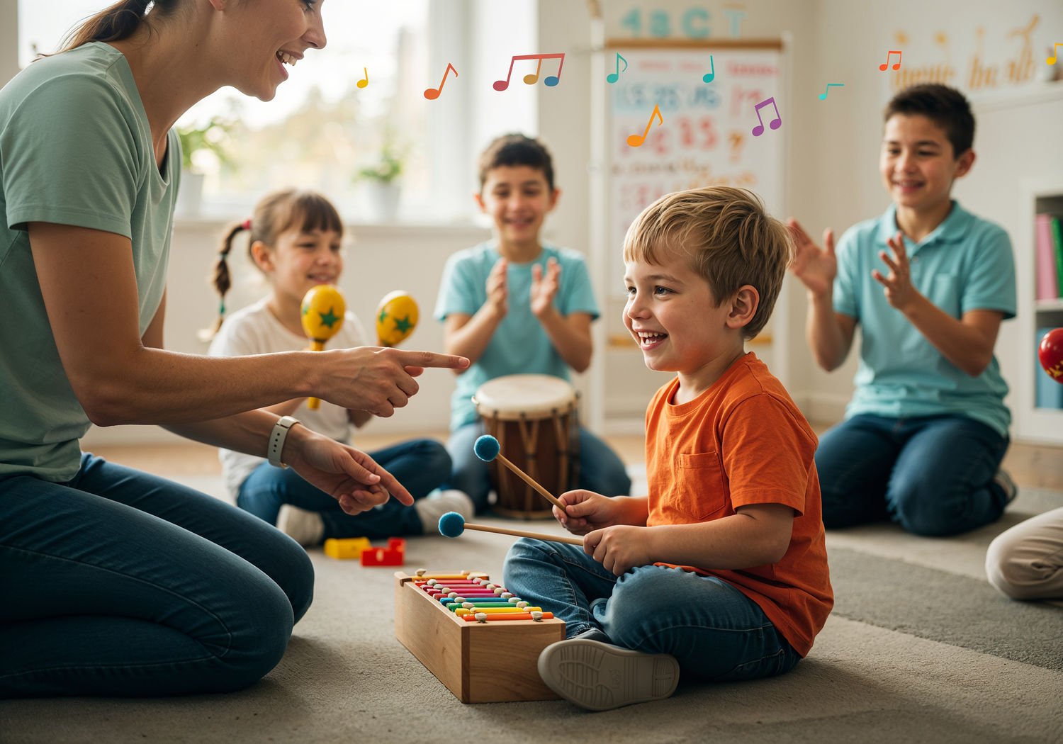 Impressionist painting, plein air, vibrant colors, capturing the moment, flickering light, visible short brush strokes, broken color technique, soft focus Impressionist painting, plein air, vibrant colors, capturing the moment, flickering light, visible short brush strokes, broken color technique, soft focus A young child with autism sitting cross-legged on the floor in a bright therapy room, smiling and playing a colorful xylophone while a compassionate therapist kneels nearby, gently guiding with a hand on the child’s shoulder; in the background, other children join in by clapping and shaking maracas in rhythm, with musical notes and sound waves floating between them, symbolizing connection and breaking isolation. ;Image without icons or texts. Style: Oil painting on canvas, impasto texture, thick layers of paint, high-key lighting, atmosphere of a hazy morning; ;Image without icons or texts. Style: Oil painting on canvas, impasto texture, thick layers of paint, high-key lighting, atmosphere of a hazy morning;