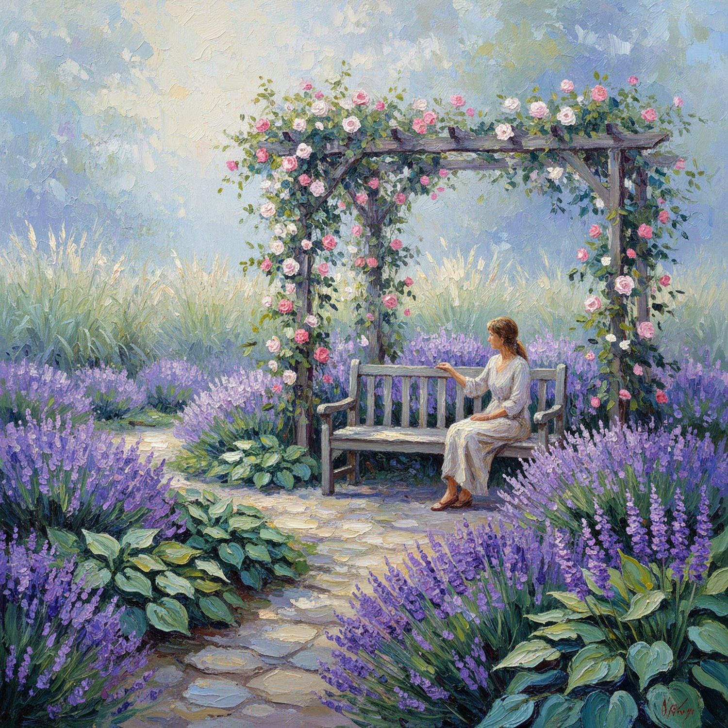 Impressionist painting, plein air, vibrant colors, capturing the moment, flickering light, visible short brush strokes, broken color technique, soft focus Impressionist painting, plein air, vibrant colors, capturing the moment, flickering light, visible short brush strokes, broken color technique, soft focus A serene sensory garden scene featuring a wooden bench at the center surrounded by blooming lavender bushes and rose climbers on a pergola, with clusters of hosta plants and salvia along a stone path for touch, tall miscanthus grasses swaying in the background for sound, soft sunlight filtering through, and a person gently touching lavender flowers while sitting relaxed on the bench. ;Image without icons or texts. Style: Oil painting on canvas, impasto texture, thick layers of paint, high-key lighting, atmosphere of a hazy morning; ;Image without icons or texts. Style: Oil painting on canvas, impasto texture, thick layers of paint, high-key lighting, atmosphere of a hazy morning;