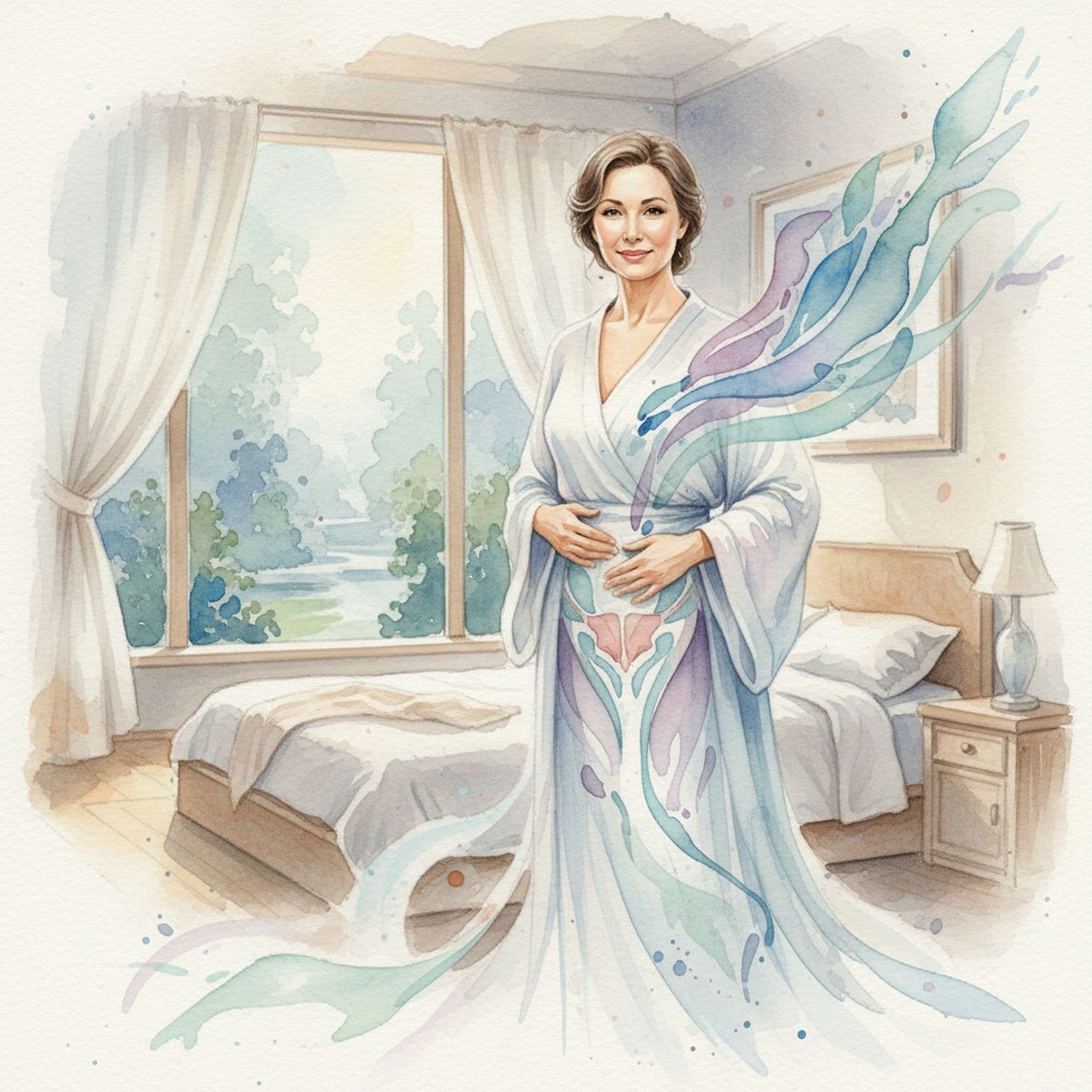 Watercolor concept art, ethereal, fantasy, delicate color transitions, blurred edges, organic textures, soft light, asian style brush strokes, of: Watercolor concept art, ethereal, fantasy, delicate color transitions, blurred edges, organic textures, soft light, asian style brush strokes, of: A confident middle-aged woman standing gracefully in a serene bedroom, smiling softly while gently touching her lower abdomen, with subtle anatomical highlights showing strengthened perineal muscles in the background, symbolizing restored intimate comfort and vitality after perineoplasty. Style: Watercolor concept art on thick watercolor paper, subtle ink stains, painted wet-on-wet technique, low contrast. Style: Watercolor concept art on thick watercolor paper, subtle ink stains, painted wet-on-wet technique, low contrast.