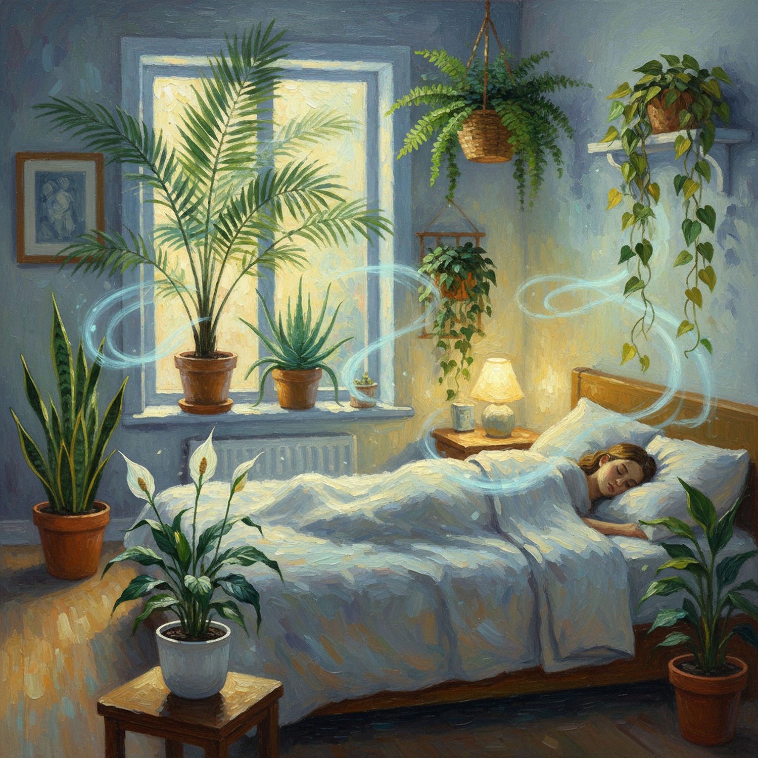 Impressionist painting, plein air, vibrant colors, capturing the moment, flickering light, visible short brush strokes, broken color technique, soft focus Impressionist painting, plein air, vibrant colors, capturing the moment, flickering light, visible short brush strokes, broken color technique, soft focus A cozy bedroom scene at night with soft lighting from a bedside lamp, featuring seven air-purifying plants strategically placed: a peace lily in a white pot on a nightstand blooming with white flowers, a tall snake plant with upright variegated leaves in a corner, an areca palm with feathery fronds in a large pot near the window, an aloe vera succulent on a windowsill with thick spiky leaves, a Boston fern hanging in a basket with lush green fronds above the bed, English ivy climbing a wall trellis beside the headboard, and pothos vines cascading from a shelf in golden-green leaves; clean air currents visualized as subtle glowing streams flowing from the plants towards a sleeping person in bed, emphasizing purification and relaxation. ;Image without icons or texts. Style: Oil painting on canvas, impasto texture, thick layers of paint, high-key lighting, atmosphere of a hazy morning; ;Image without icons or texts. Style: Oil painting on canvas, impasto texture, thick layers of paint, high-key lighting, atmosphere of a hazy morning;