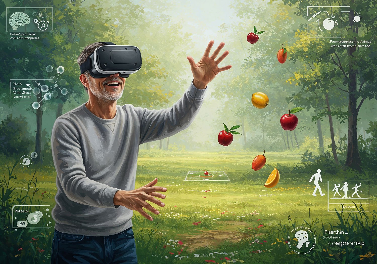 Impressionist painting, plein air, vibrant colors, capturing the moment, flickering light, visible short brush strokes, broken color technique, soft focus Impressionist painting, plein air, vibrant colors, capturing the moment, flickering light, visible short brush strokes, broken color technique, soft focus A middle-aged patient recovering from a stroke, smiling while wearing VR goggles and using motion sensors to play a virtual game, reaching out to catch floating fruits in a vibrant digital forest environment; in the background, icons of brain neurons connecting, a puzzle being solved, and healthy lifestyle elements like fruits, running figures, and educational game screens overlayed on a hospital rehab room setting. ;Image without icons or texts. Style: Oil painting on canvas, impasto texture, thick layers of paint, high-key lighting, atmosphere of a hazy morning; ;Image without icons or texts. Style: Oil painting on canvas, impasto texture, thick layers of paint, high-key lighting, atmosphere of a hazy morning;