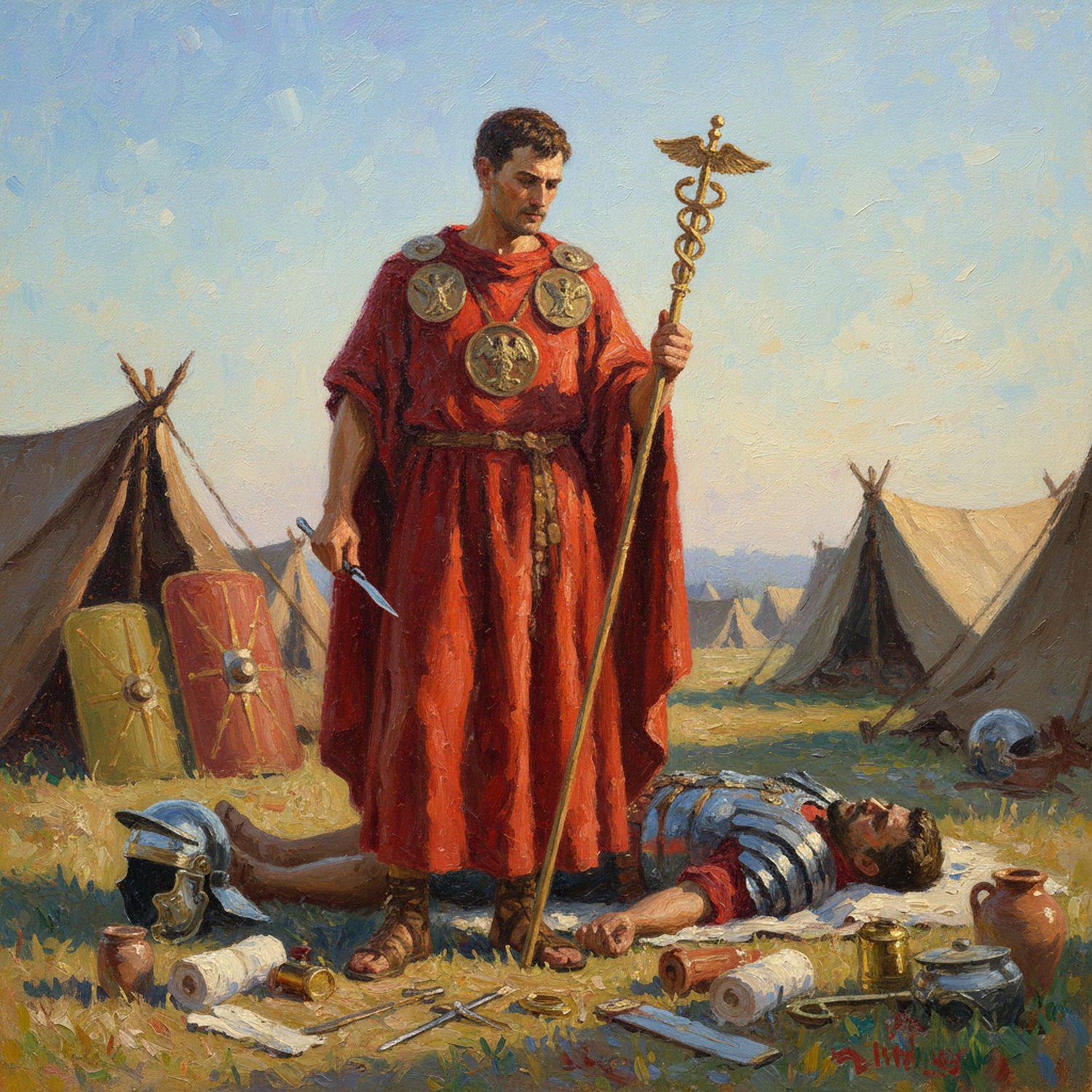 Impressionist painting, plein air, vibrant colors, capturing the moment, flickering light, visible short brush strokes, broken color technique, soft focus Impressionist painting, plein air, vibrant colors, capturing the moment, flickering light, visible short brush strokes, broken color technique, soft focus A Roman army medic in a long red tunic reaching the knees, adorned with circular medallions on the shoulders and chest depicting the god Mercury holding a caduceus staff entwined with two snakes and topped with wings, standing in a military camp near a wounded legionary soldier on the ground, the medic holding a caduceus staff in one hand and a scalpel in the other, with bandages and medical tools scattered nearby, Roman tents and shields in the background under a clear sky. ;Image without icons or texts. Style: Oil painting on canvas, impasto texture, thick layers of paint, high-key lighting, atmosphere of a hazy morning; ;Image without icons or texts. Style: Oil painting on canvas, impasto texture, thick layers of paint, high-key lighting, atmosphere of a hazy morning;