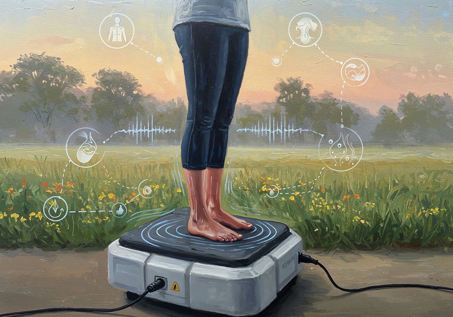 Impressionist painting, plein air, vibrant colors, capturing the moment, flickering light, visible short brush strokes, broken color technique, soft focus Impressionist painting, plein air, vibrant colors, capturing the moment, flickering light, visible short brush strokes, broken color technique, soft focus A patient standing relaxed on a vibration platform device in a therapy room, with gentle low-frequency sound waves visualized as soft, rippling blue lines penetrating their muscles and tissues, improving circulation and relieving pain, surrounded by subtle icons of blood flow, relaxed muscles, and a therapist adjusting controls nearby. ;Image without icons or texts. Style: Oil painting on canvas, impasto texture, thick layers of paint, high-key lighting, atmosphere of a hazy morning; ;Image without icons or texts. Style: Oil painting on canvas, impasto texture, thick layers of paint, high-key lighting, atmosphere of a hazy morning;