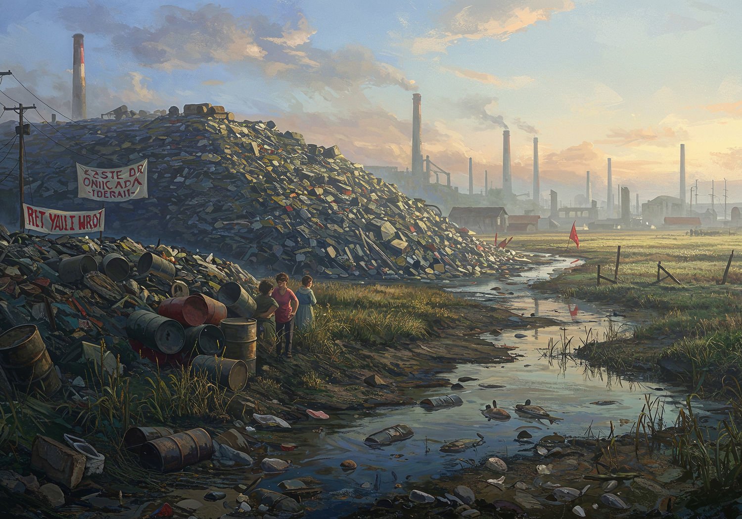Impressionist painting, plein air, vibrant colors, capturing the moment, flickering light, visible short brush strokes, broken color technique, soft focus Impressionist painting, plein air, vibrant colors, capturing the moment, flickering light, visible short brush strokes, broken color technique, soft focus A toxic waste landfill situated near a residential neighborhood, with piles of industrial waste including barrels of chemicals and heavy metals leaking into the surrounding soil and a nearby river; polluted groundwater seeping towards homes where families, including children, appear concerned and ill, with wilted plants and dead fish in the water symbolizing environmental damage; in the background, protest signs and abandoned factories highlighting social and economic decline. ;Image without icons or texts. Style: Oil painting on canvas, impasto texture, thick layers of paint, high-key lighting, atmosphere of a hazy morning; ;Image without icons or texts. Style: Oil painting on canvas, impasto texture, thick layers of paint, high-key lighting, atmosphere of a hazy morning;