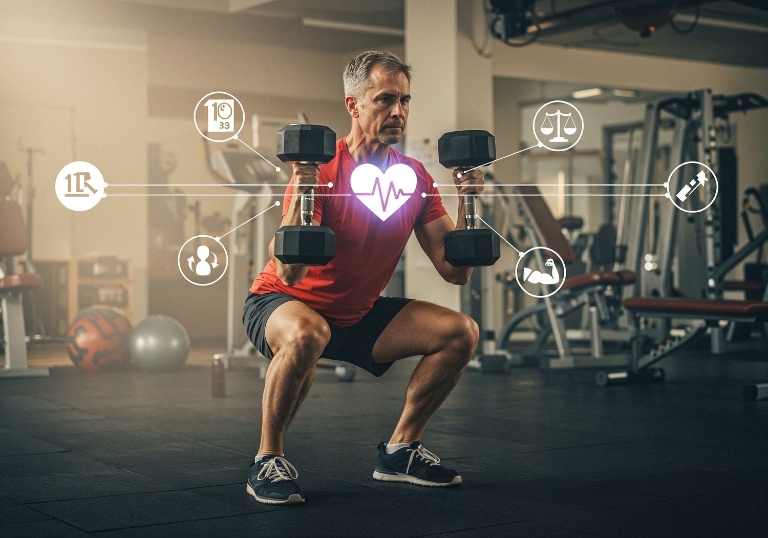 Impressionist painting, plein air, vibrant colors, capturing the moment, flickering light, visible short brush strokes, broken color technique, soft focus Impressionist painting, plein air, vibrant colors, capturing the moment, flickering light, visible short brush strokes, broken color technique, soft focus A middle-aged person performing a squat with dumbbells in a gym, muscles engaged and expression focused, with a large stylized healthy heart icon glowing above their chest, surrounded by icons of downward arrows for blood pressure, balanced lipid scales, and growing muscle silhouettes, all connected by positive energy lines to the heart. ;Image without icons or texts. Style: Oil painting on canvas, impasto texture, thick layers of paint, high-key lighting, atmosphere of a hazy morning; ;Image without icons or texts. Style: Oil painting on canvas, impasto texture, thick layers of paint, high-key lighting, atmosphere of a hazy morning;