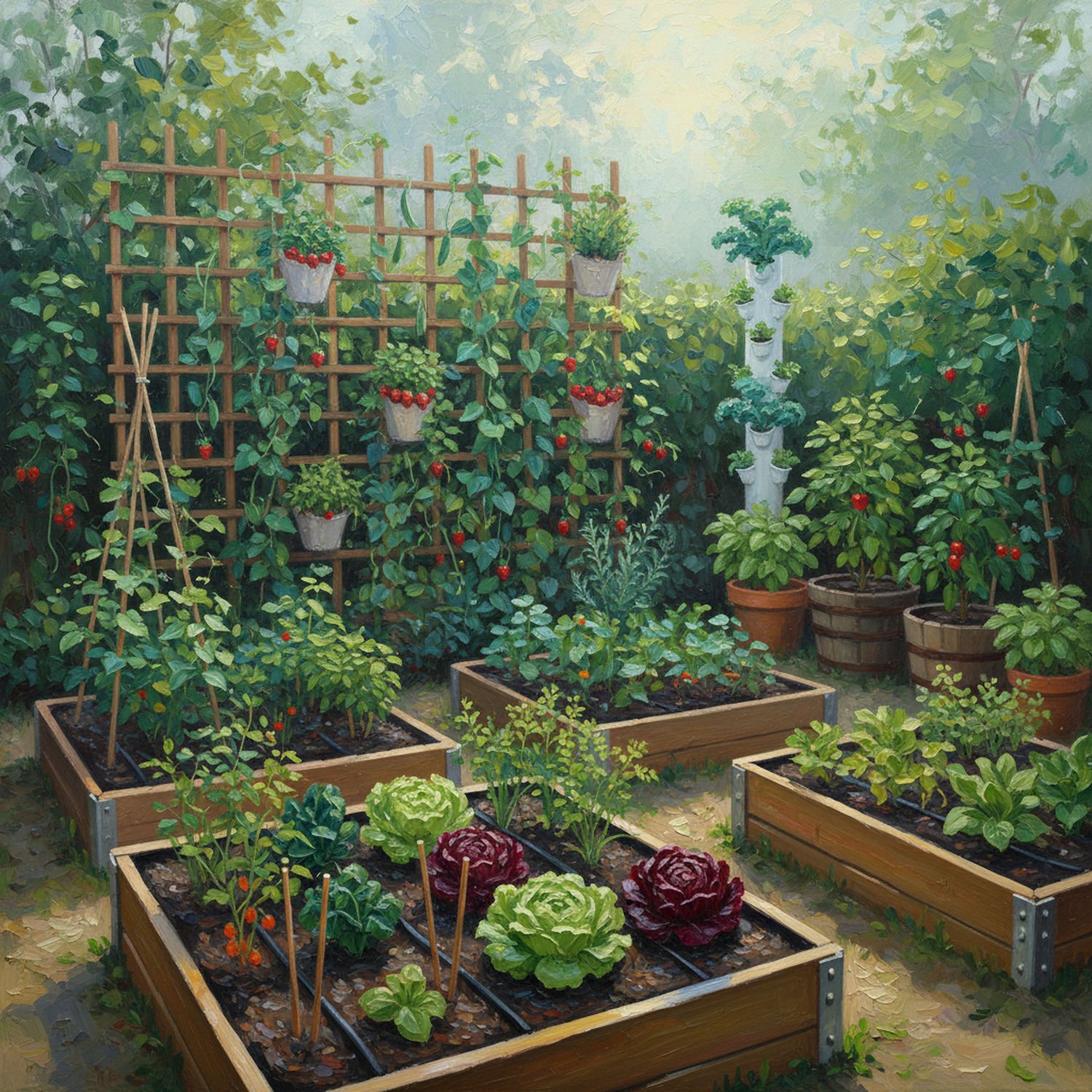 Impressionist painting, plein air, vibrant colors, capturing the moment, flickering light, visible short brush strokes, broken color technique, soft focus Impressionist painting, plein air, vibrant colors, capturing the moment, flickering light, visible short brush strokes, broken color technique, soft focus A small backyard garden plot demonstrating intensive vegetable cultivation methods: in the foreground, wooden raised beds filled with soil and planted densely with carrots, beans, tomatoes, lettuce, and spinach in square foot patterns, with drip irrigation tubes and mulch covering the soil; in the background, a vertical wall with trellises supporting climbing peas, cucumbers, and beans, alongside fabric pockets holding strawberries and herbs, and a hydroponic tower growing leafy greens like kale; nearby, containers like barrels and pots with potatoes and peppers, integrated with companion plants such as basil near tomatoes; overall, a compact 10-20 m² space lush with healthy, abundant vegetables under sunlight, evoking self-sufficiency and ecological gardening. ;Image without icons or texts. Style: Oil painting on canvas, impasto texture, thick layers of paint, high-key lighting, atmosphere of a hazy morning; ;Image without icons or texts. Style: Oil painting on canvas, impasto texture, thick layers of paint, high-key lighting, atmosphere of a hazy morning;