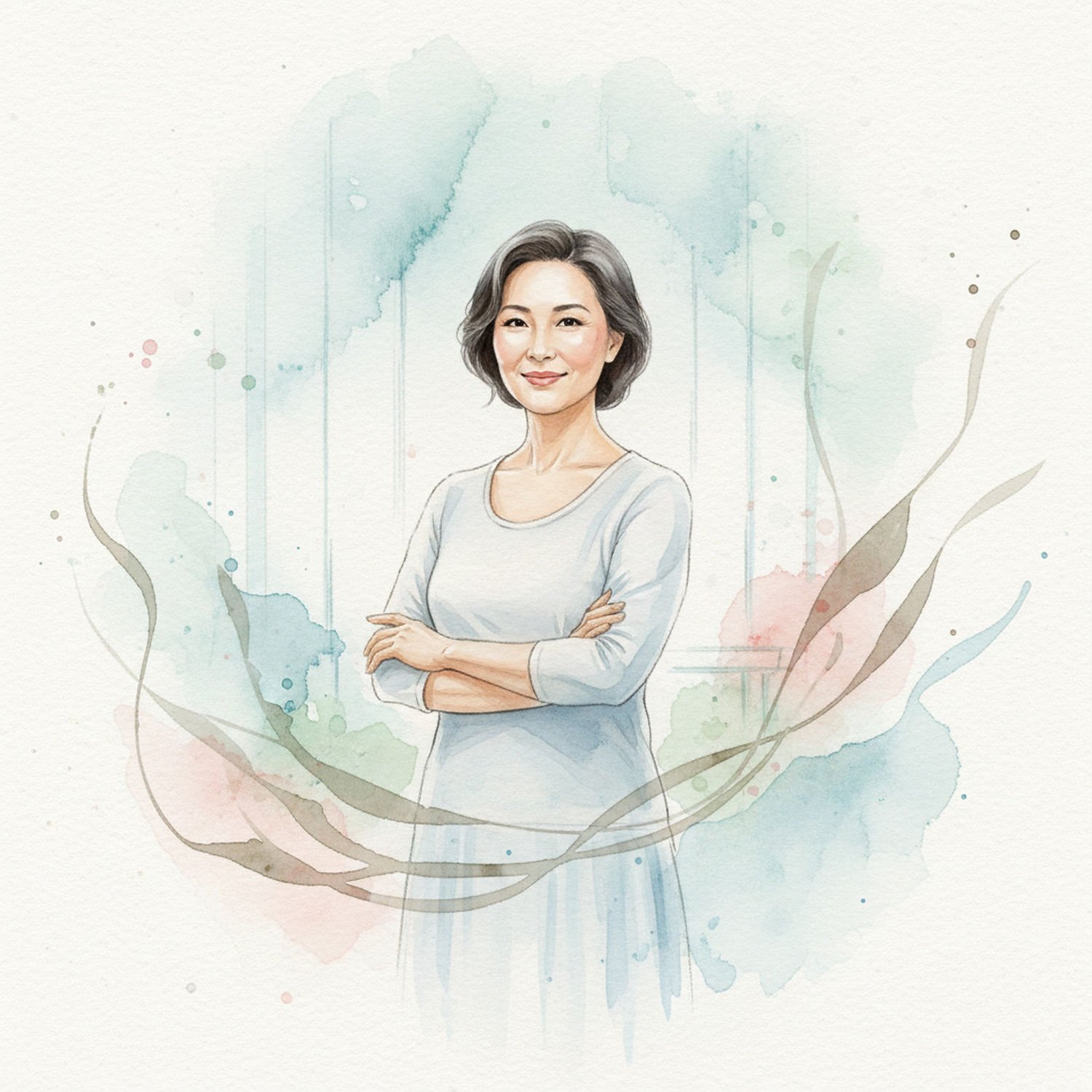 Watercolor concept art, ethereal, fantasy, delicate color transitions, blurred edges, organic textures, soft light, asian style brush strokes, of: Watercolor concept art, ethereal, fantasy, delicate color transitions, blurred edges, organic textures, soft light, asian style brush strokes, of: A confident middle-aged woman standing in a serene, softly lit room, smiling with arms gently crossed over her chest, her posture relaxed and empowered, symbolizing restored intimate comfort and self-assurance after vaginoplasty, with faint abstract lines representing strengthened pelvic muscles in the background. Style: Watercolor concept art on thick watercolor paper, subtle ink stains, painted wet-on-wet technique, low contrast. Style: Watercolor concept art on thick watercolor paper, subtle ink stains, painted wet-on-wet technique, low contrast.