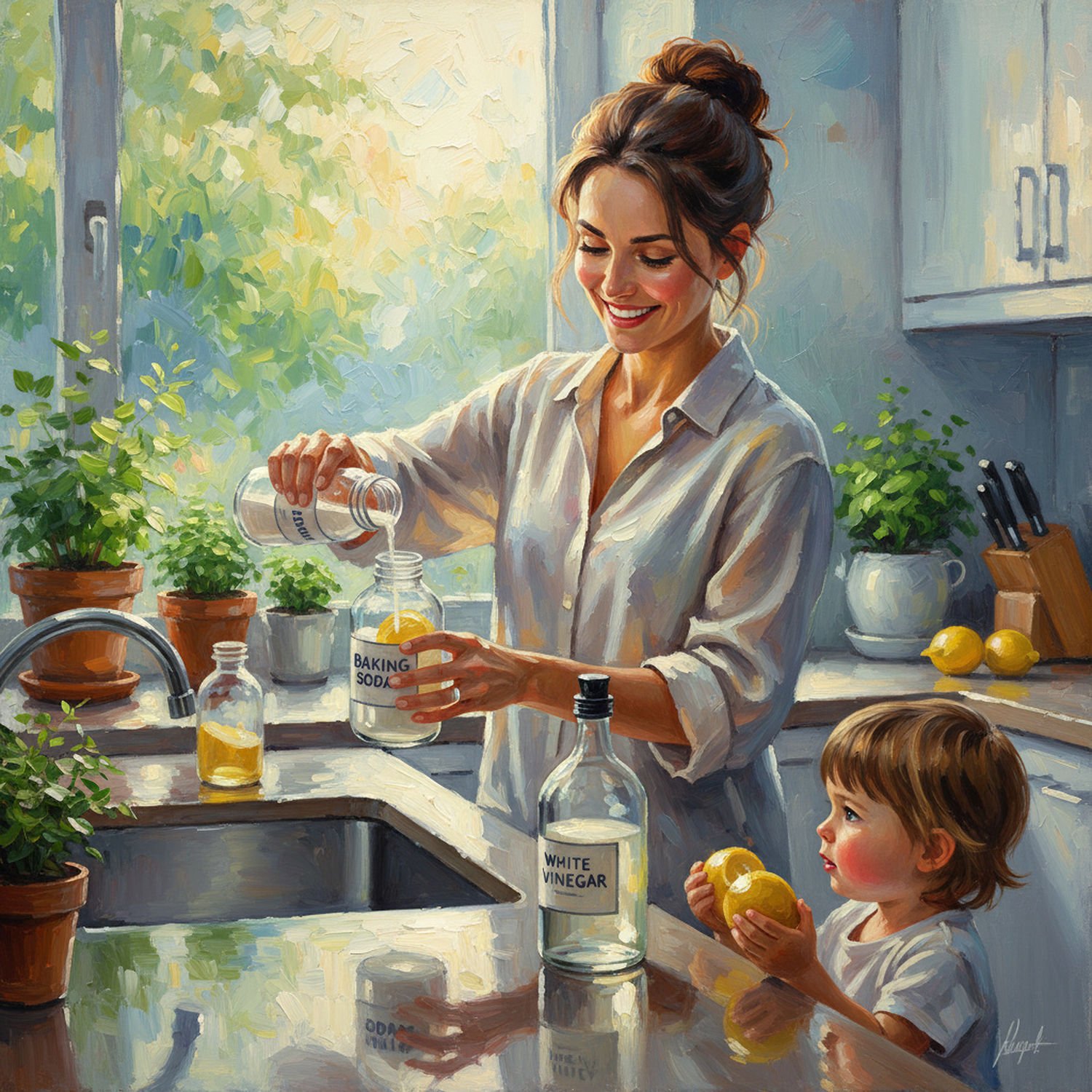 Impressionist painting, plein air, vibrant colors, capturing the moment, flickering light, visible short brush strokes, broken color technique, soft focus Impressionist painting, plein air, vibrant colors, capturing the moment, flickering light, visible short brush strokes, broken color technique, soft focus A cheerful woman in a modern kitchen preparing a natural cleaning spray by mixing white vinegar, baking soda, and fresh lemon juice in a reusable glass bottle with a sprayer, surrounded by sparkling clean countertops, a shiny sink, and potted plants; nearby, a child safely watches while holding a lemon, with subtle icons of a green earth and allergy-free symbols in the background, emphasizing eco-friendliness and family health. ;Image without icons or texts. Style: Oil painting on canvas, impasto texture, thick layers of paint, high-key lighting, atmosphere of a hazy morning; ;Image without icons or texts. Style: Oil painting on canvas, impasto texture, thick layers of paint, high-key lighting, atmosphere of a hazy morning;