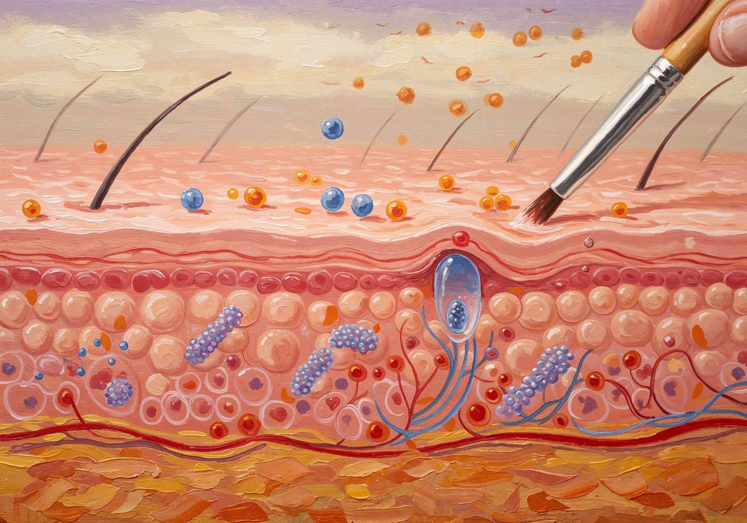 Impressionist painting, plein air, vibrant colors, capturing the moment, flickering light, visible short brush strokes, broken color technique, soft focus Impressionist painting, plein air, vibrant colors, capturing the moment, flickering light, visible short brush strokes, broken color technique, soft focus A cross-section of human skin showing the stratum corneum as a protective barrier layer composed of corneocytes surrounded by lipids like ceramides and fatty acids, with water molecules retained within; beneficial bacteria such as Staphylococcus epidermidis and Lactobacillus clustered harmoniously on the surface, competing with pathogens; in the background, a healthy skin ecosystem with balanced pH and moisture, contrasted by a damaged section with cracked barrier, water loss via evaporation, depleted lipids, overgrown pathogens like Staphylococcus aureus and Candida, and inflammatory cytokines; elements of care like emollients and probiotics being applied to restore balance. ;Image without icons or texts. Style: Oil painting on canvas, impasto texture, thick layers of paint, high-key lighting, atmosphere of a hazy morning; ;Image without icons or texts. Style: Oil painting on canvas, impasto texture, thick layers of paint, high-key lighting, atmosphere of a hazy morning;