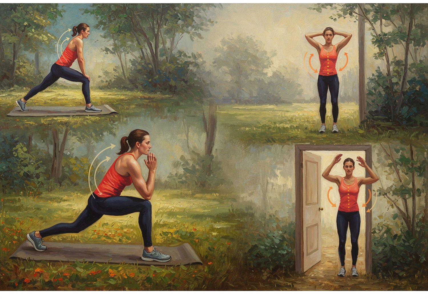 Impressionist painting, plein air, vibrant colors, capturing the moment, flickering light, visible short brush strokes, broken color technique, soft focus Impressionist painting, plein air, vibrant colors, capturing the moment, flickering light, visible short brush strokes, broken color technique, soft focus A diverse adult person in athletic wear performing a series of mobilization exercises: in the foreground, doing a hip flexor lunge stretch with one leg forward and hips pushing ahead; nearby, rotating hips in standing position with hands on hips; in the background, opening the chest by leaning into a doorway with arms on the frame, and swinging arms in circles; subtle overlays show improved joint flexibility with curved arrows indicating range of motion around hips, chest, and shoulders; a neutral spine alignment is highlighted with a straight line from head to hips, emphasizing posture and injury prevention. ;Image without icons or texts. Style: Oil painting on canvas, impasto texture, thick layers of paint, high-key lighting, atmosphere of a hazy morning; ;Image without icons or texts. Style: Oil painting on canvas, impasto texture, thick layers of paint, high-key lighting, atmosphere of a hazy morning;