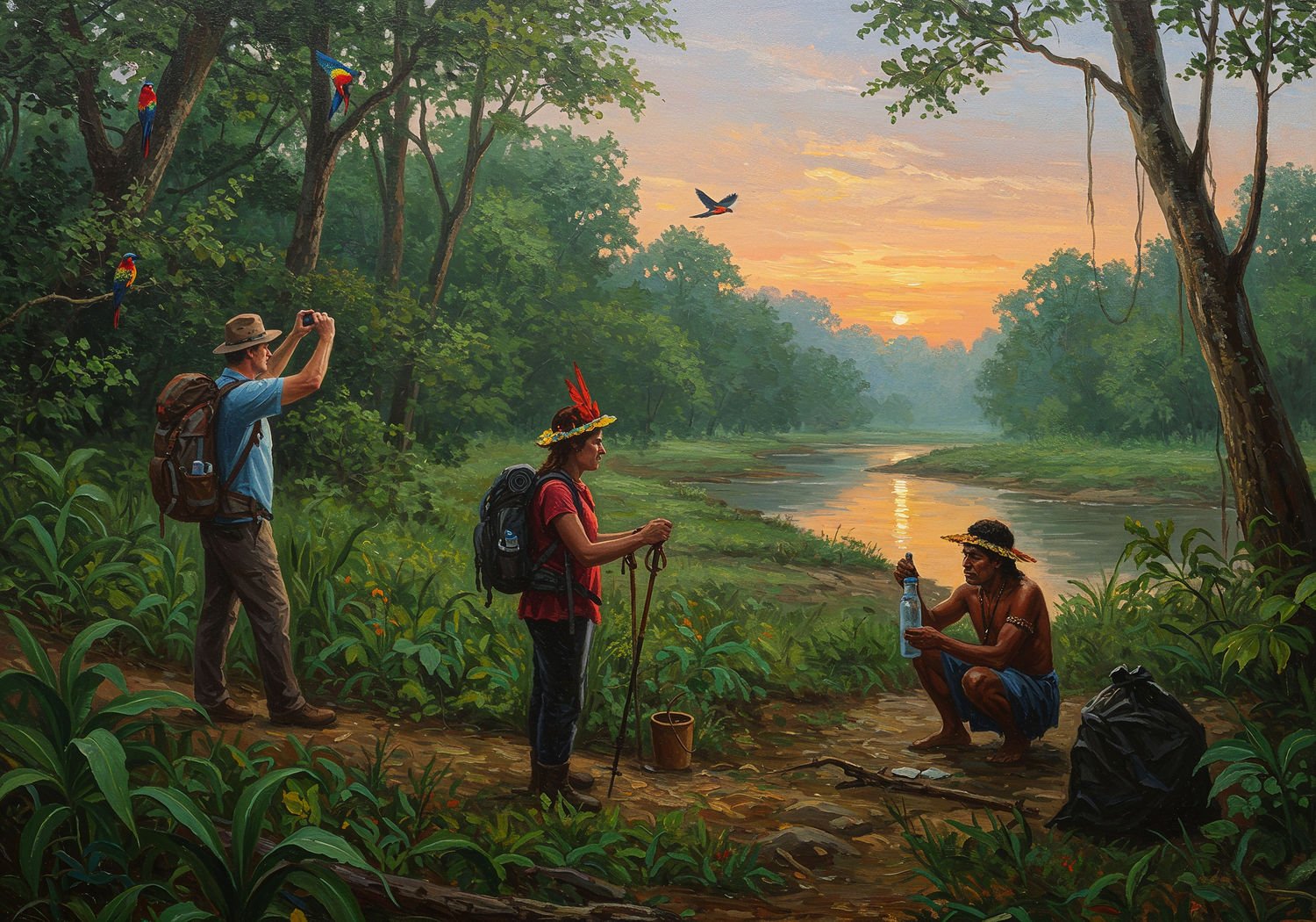 Impressionist painting, plein air, vibrant colors, capturing the moment, flickering light, visible short brush strokes, broken color technique, soft focus Impressionist painting, plein air, vibrant colors, capturing the moment, flickering light, visible short brush strokes, broken color technique, soft focus A serene scene of a diverse group of travelers hiking through a lush forest trail, one person mindfully observing colorful birds in the canopy, another interacting with a local indigenous guide sharing traditional knowledge near a river, with sustainable elements like reusable water bottles and no litter, evoking a sense of relaxation, connection to nature, and community support under a vibrant sunset sky. ;Image without icons or texts. Style: Oil painting on canvas, impasto texture, thick layers of paint, high-key lighting, atmosphere of a hazy morning; ;Image without icons or texts. Style: Oil painting on canvas, impasto texture, thick layers of paint, high-key lighting, atmosphere of a hazy morning;