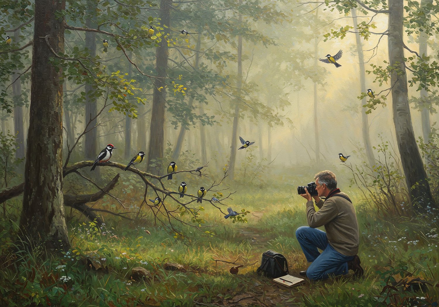 Impressionist painting, plein air, vibrant colors, capturing the moment, flickering light, visible short brush strokes, broken color technique, soft focus Impressionist painting, plein air, vibrant colors, capturing the moment, flickering light, visible short brush strokes, broken color technique, soft focus A serene forest clearing in Poland’s Białowieża Forest at dawn, with a middle-aged person kneeling quietly with a camera aimed at a flock of colorful birds like woodpeckers and tits perched on branches, sunlight filtering through leaves, a notebook nearby for notes, evoking mindfulness and connection to nature. ;Image without icons or texts. Style: Oil painting on canvas, impasto texture, thick layers of paint, high-key lighting, atmosphere of a hazy morning; ;Image without icons or texts. Style: Oil painting on canvas, impasto texture, thick layers of paint, high-key lighting, atmosphere of a hazy morning;