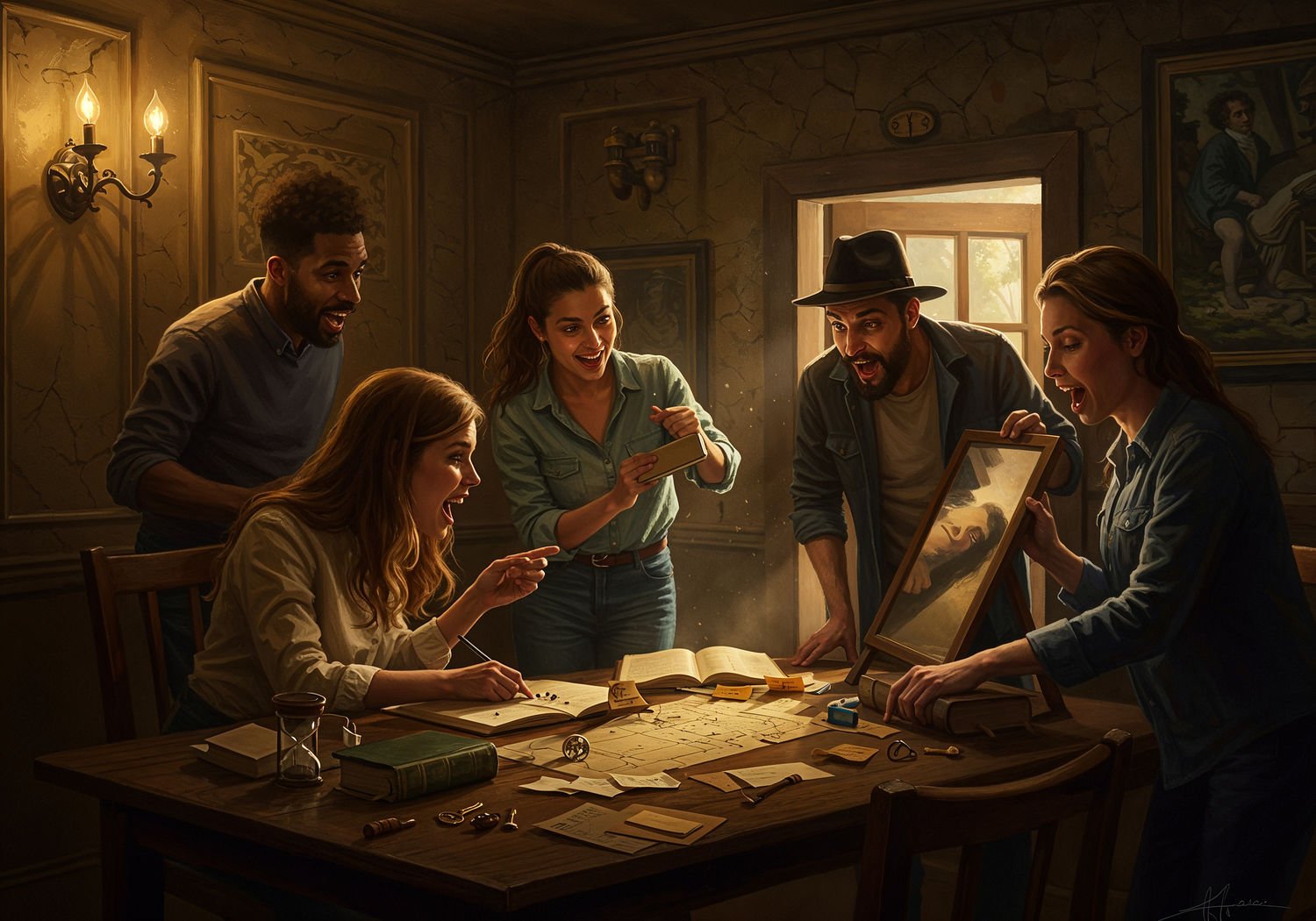 Impressionist painting, plein air, vibrant colors, capturing the moment, flickering light, visible short brush strokes, broken color technique, soft focus Impressionist painting, plein air, vibrant colors, capturing the moment, flickering light, visible short brush strokes, broken color technique, soft focus A diverse group of four excited adults in a dimly lit, mystery-themed escape room, collaboratively solving logic puzzles: one person deciphers a code on an old book, another assembles a puzzle map on a table cluttered with clues like locks, keys, and hidden notes, a third uses a mirror to reflect light onto a sensor, while the fourth checks a ticking hourglass timer on the wall, all communicating animatedly with smiles and gestures of teamwork as they approach an ornate locked door. ;Image without icons or texts. Style: Oil painting on canvas, impasto texture, thick layers of paint, high-key lighting, atmosphere of a hazy morning; ;Image without icons or texts. Style: Oil painting on canvas, impasto texture, thick layers of paint, high-key lighting, atmosphere of a hazy morning;