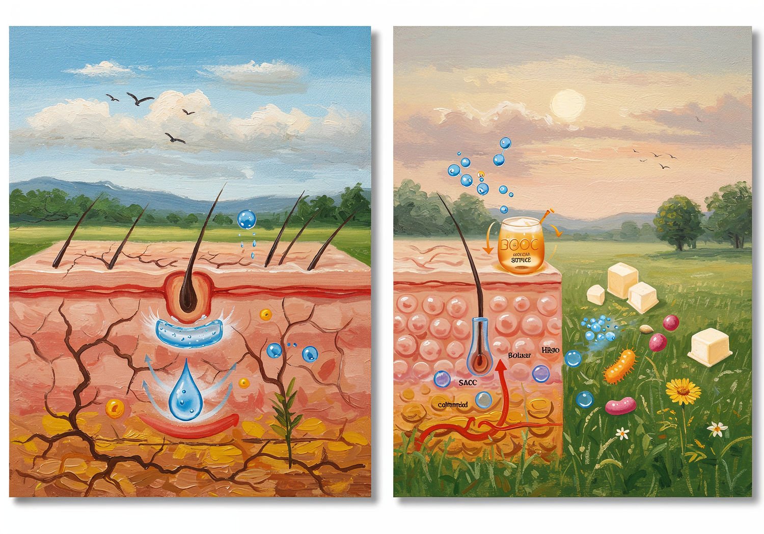 Impressionist painting, plein air, vibrant colors, capturing the moment, flickering light, visible short brush strokes, broken color technique, soft focus Impressionist painting, plein air, vibrant colors, capturing the moment, flickering light, visible short brush strokes, broken color technique, soft focus A cross-section of human skin showing two sides for comparison: on the left, dry skin with cracked barrier, UV rays penetrating deeply causing oxidative damage and harmful bacteria overgrowth; on the right, hydrated skin with intact lipid barrier reinforced by humectants drawing in water molecules and occlusive layer sealing moisture, UV rays blocked effectively by sunscreen, beneficial microbiome bacteria thriving, and antioxidants neutralizing free radicals. Include icons of humectants like hyaluronic acid and occlusion like shea butter integrating into the skin structure. ;Image without icons or texts. Style: Oil painting on canvas, impasto texture, thick layers of paint, high-key lighting, atmosphere of a hazy morning; ;Image without icons or texts. Style: Oil painting on canvas, impasto texture, thick layers of paint, high-key lighting, atmosphere of a hazy morning;