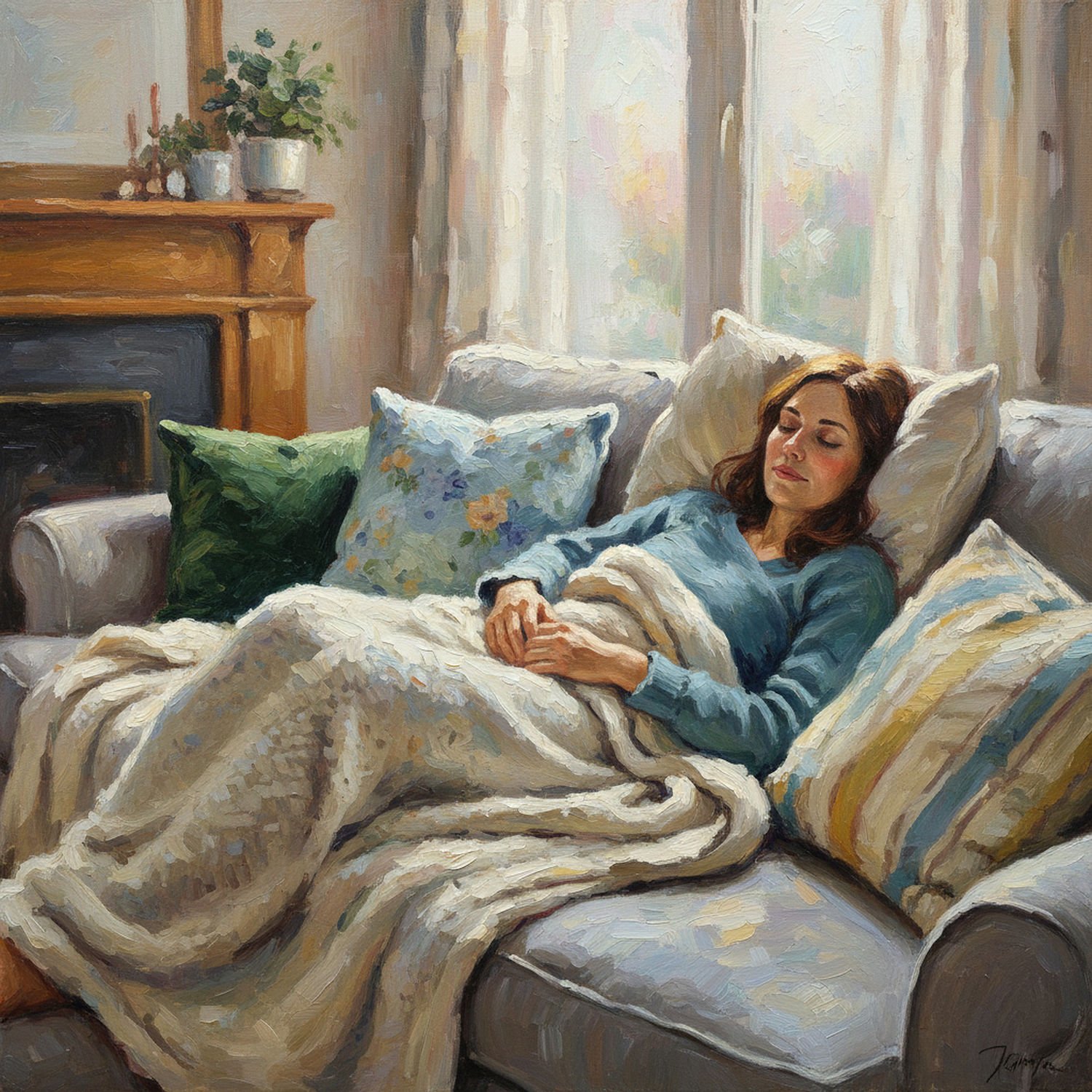 Impressionist painting, plein air, vibrant colors, capturing the moment, flickering light, visible short brush strokes, broken color technique, soft focus Impressionist painting, plein air, vibrant colors, capturing the moment, flickering light, visible short brush strokes, broken color technique, soft focus A cozy living room scene with a person lounging on a sofa, wrapped snugly in a soft, textured blanket made of wool and microfiber, head resting on a plush pillow filled with down feathers, surrounded by an assortment of decorative pillows in varied fabrics like velvet, cotton, and linen scattered on the furniture, evoking a sense of relaxation and emotional comfort as the person gently touches the blanket’s surface with a calm expression. ;Image without icons or texts. Style: Oil painting on canvas, impasto texture, thick layers of paint, high-key lighting, atmosphere of a hazy morning; ;Image without icons or texts. Style: Oil painting on canvas, impasto texture, thick layers of paint, high-key lighting, atmosphere of a hazy morning;