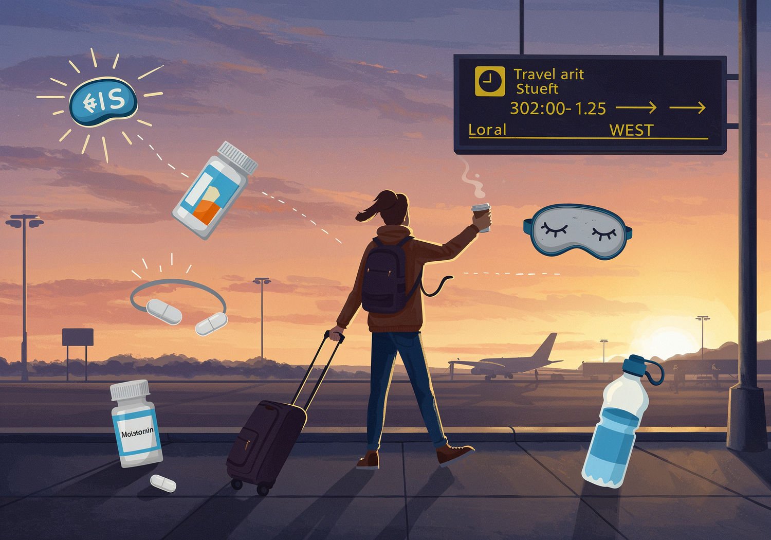 Impressionist painting, plein air, vibrant colors, capturing the moment, flickering light, visible short brush strokes, broken color technique, soft focus Impressionist painting, plein air, vibrant colors, capturing the moment, flickering light, visible short brush strokes, broken color technique, soft focus A traveler stepping off an airplane into a new time zone at sunrise, holding a coffee cup in one hand and a melatonin pill bottle in the other, with a wristwatch showing a time shift from east to west, surrounded by icons of bright sunlight rays, a sleep mask, and a water bottle, while looking energized and adjusting to the local clock on a nearby airport sign. ;Image without icons or texts. Style: Oil painting on canvas, impasto texture, thick layers of paint, high-key lighting, atmosphere of a hazy morning; ;Image without icons or texts. Style: Oil painting on canvas, impasto texture, thick layers of paint, high-key lighting, atmosphere of a hazy morning;