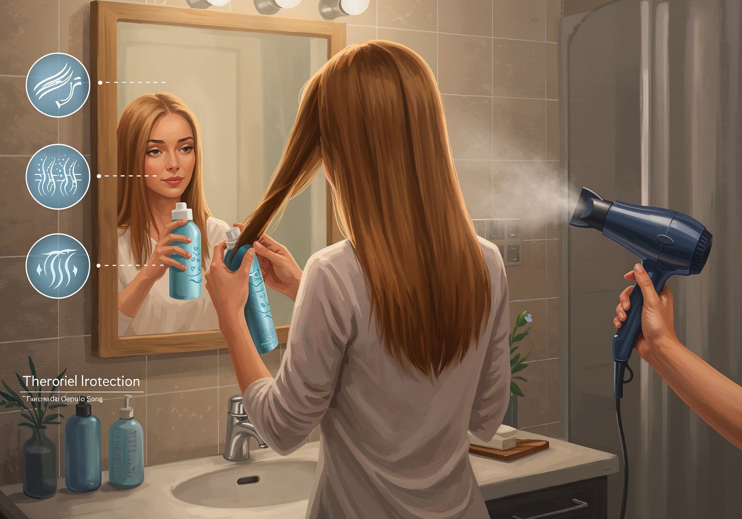 Impressionist painting, plein air, vibrant colors, capturing the moment, flickering light, visible short brush strokes, broken color technique, soft focus Impressionist painting, plein air, vibrant colors, capturing the moment, flickering light, visible short brush strokes, broken color technique, soft focus A woman with long, healthy hair standing in front of a mirror in a bathroom, applying a heat protectant spray to damp hair with one hand while holding a hairdryer set to cool air mode in the other, with subtle visual elements showing hair cuticles closing under cool air, a bottle of thermal protection product on the counter, and icons of shielded hair strands versus damaged ones in the background. ;Image without icons or texts. Style: Oil painting on canvas, impasto texture, thick layers of paint, high-key lighting, atmosphere of a hazy morning; ;Image without icons or texts. Style: Oil painting on canvas, impasto texture, thick layers of paint, high-key lighting, atmosphere of a hazy morning;