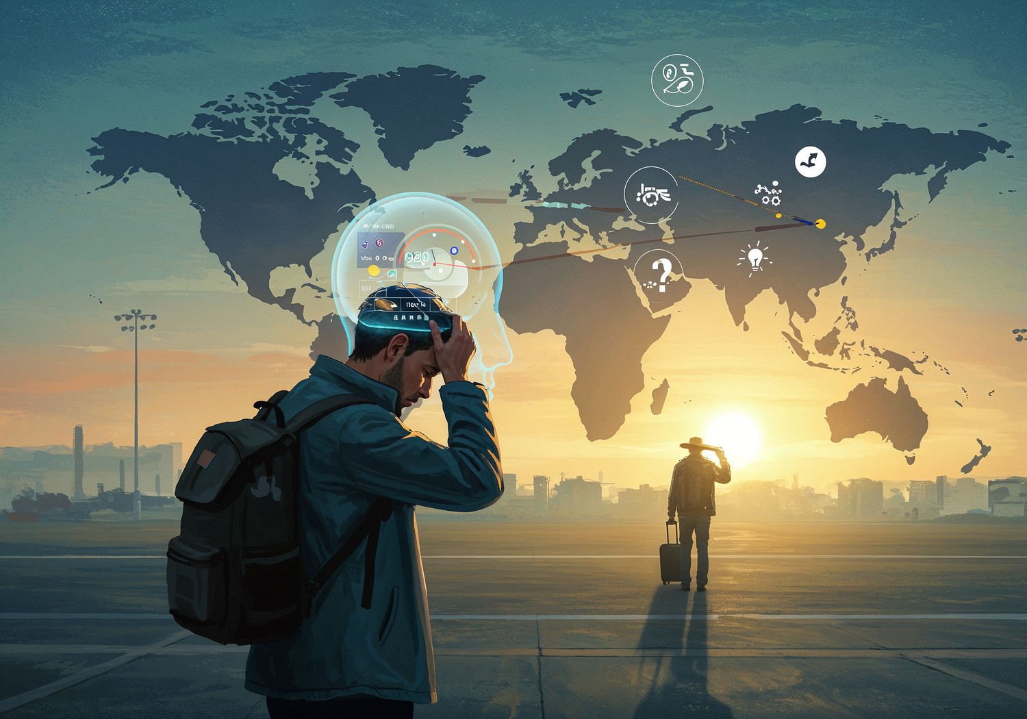 Impressionist painting, plein air, vibrant colors, capturing the moment, flickering light, visible short brush strokes, broken color technique, soft focus Impressionist painting, plein air, vibrant colors, capturing the moment, flickering light, visible short brush strokes, broken color technique, soft focus A weary traveler stepping off an airplane at a new destination, looking confused and fatigued under a bright morning sun, while inside their transparent head a biological clock shows nighttime with melatonin surging and cortisol low; mismatched day-night cycles overlay the scene with icons of disrupted sleep, digestive issues, and scattered concentration symbols like broken gears and fading light bulbs; background features a world map highlighting crossed time zones from Europe to Asia. ;Image without icons or texts. Style: Oil painting on canvas, impasto texture, thick layers of paint, high-key lighting, atmosphere of a hazy morning; ;Image without icons or texts. Style: Oil painting on canvas, impasto texture, thick layers of paint, high-key lighting, atmosphere of a hazy morning;