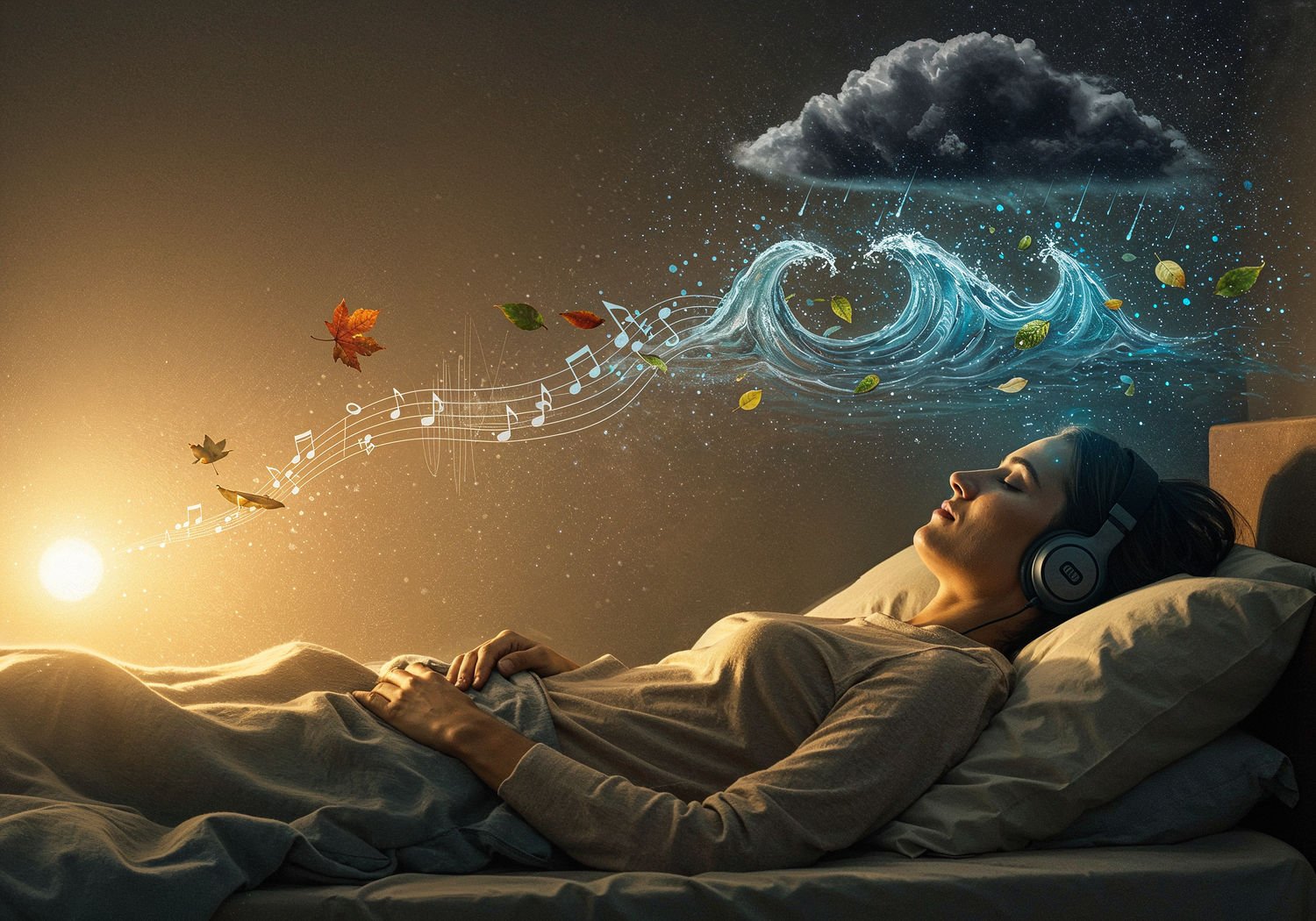 Impressionist painting, plein air, vibrant colors, capturing the moment, flickering light, visible short brush strokes, broken color technique, soft focus Impressionist painting, plein air, vibrant colors, capturing the moment, flickering light, visible short brush strokes, broken color technique, soft focus A serene scene of a person lying relaxed on a soft bed in a dimly lit room, wearing comfortable headphones, with eyes closed in relief as gentle musical notes and sound waves emanate from the headphones, transforming into soothing elements like flowing water waves, falling raindrops, and floating leaves, while dark pain clouds above their head dissolve into soft light, symbolizing migraine relief through music therapy. ;Image without icons or texts. Style: Oil painting on canvas, impasto texture, thick layers of paint, high-key lighting, atmosphere of a hazy morning; ;Image without icons or texts. Style: Oil painting on canvas, impasto texture, thick layers of paint, high-key lighting, atmosphere of a hazy morning;