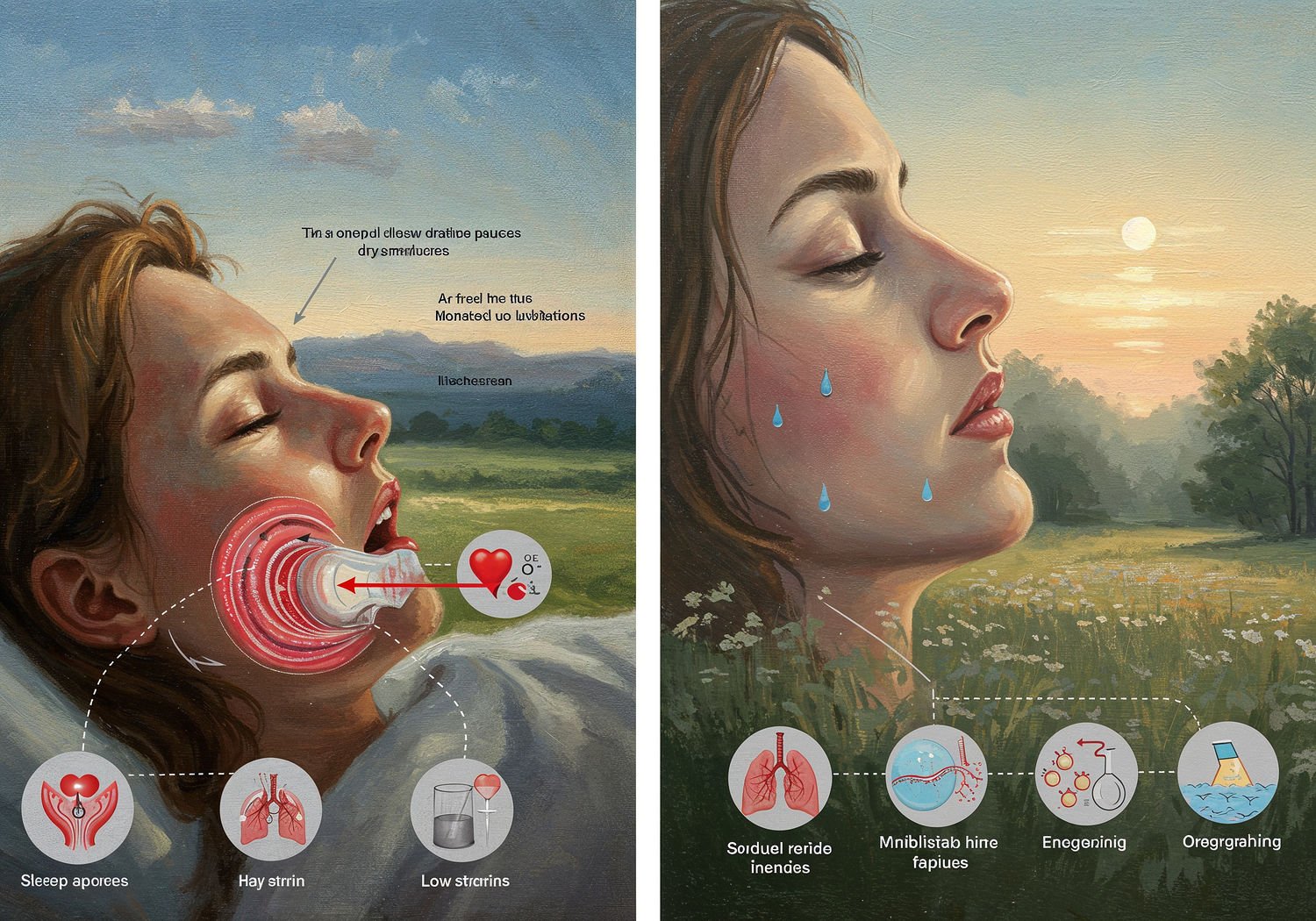 Impressionist painting, plein air, vibrant colors, capturing the moment, flickering light, visible short brush strokes, broken color technique, soft focus Impressionist painting, plein air, vibrant colors, capturing the moment, flickering light, visible short brush strokes, broken color technique, soft focus A split-scene illustration: on the left, a person sleeping with mouth open, air flowing directly into dry throat causing swelling and snoring vibrations, icons of sleep apnea pauses, low oxygen, heart strain, and daytime fatigue; on the right, the same person sleeping peacefully breathing through nose, air being filtered by nasal hairs and mucus, humidified and warmed, flowing smoothly to oxygenated lungs, icons of deep sleep, nitric oxide boost, reduced inflammation, and energetic morning. ;Image without icons or texts. Style: Oil painting on canvas, impasto texture, thick layers of paint, high-key lighting, atmosphere of a hazy morning; ;Image without icons or texts. Style: Oil painting on canvas, impasto texture, thick layers of paint, high-key lighting, atmosphere of a hazy morning;