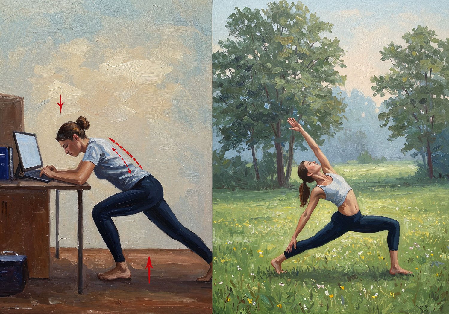 Impressionist painting, plein air, vibrant colors, capturing the moment, flickering light, visible short brush strokes, broken color technique, soft focus Impressionist painting, plein air, vibrant colors, capturing the moment, flickering light, visible short brush strokes, broken color technique, soft focus A split-image illustration showing the negative effects of prolonged sitting on the left side, with a person slouched at a desk with forward head posture, rounded shoulders, and flattened lumbar curve, and on the right side, the same person demonstrating correct posture through exercises: performing a plank to engage core muscles, stretching hip flexors in a lunge position, and standing in mountain pose with aligned spine, shoulders back, and neutral pelvis. ;Image without icons or texts. Style: Oil painting on canvas, impasto texture, thick layers of paint, high-key lighting, atmosphere of a hazy morning; ;Image without icons or texts. Style: Oil painting on canvas, impasto texture, thick layers of paint, high-key lighting, atmosphere of a hazy morning;