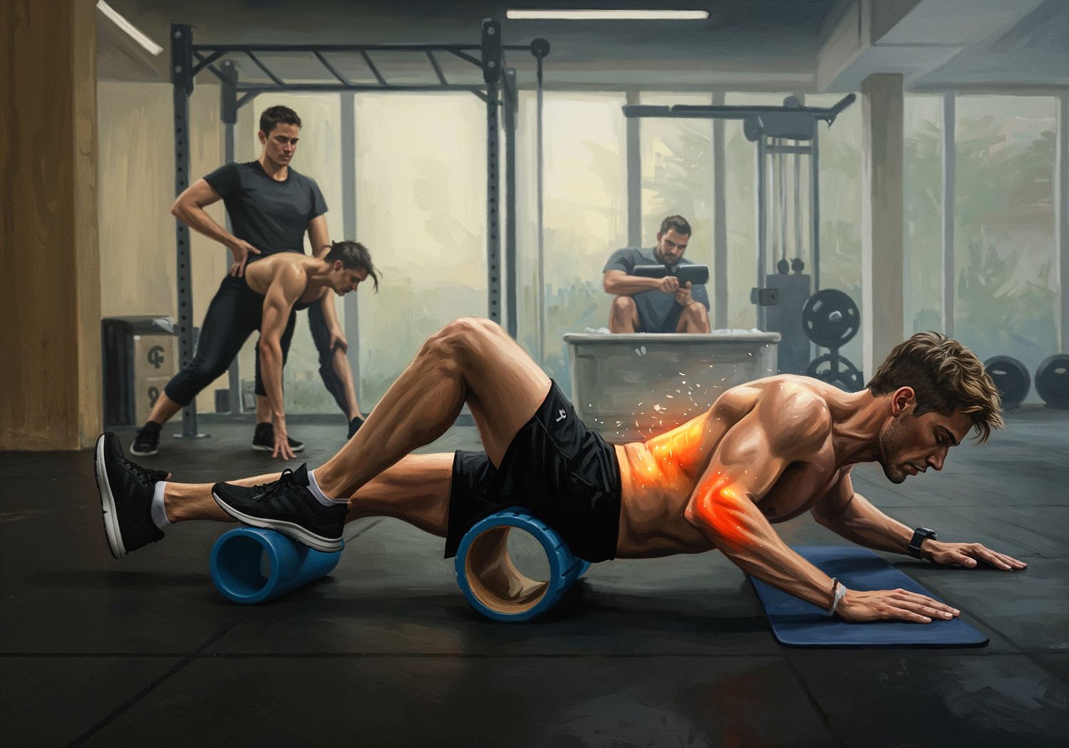Impressionist painting, plein air, vibrant colors, capturing the moment, flickering light, visible short brush strokes, broken color technique, soft focus Impressionist painting, plein air, vibrant colors, capturing the moment, flickering light, visible short brush strokes, broken color technique, soft focus An athlete in a gym setting recovering from training: in the foreground, the athlete rolls their leg on a foam roller to release muscle tension; in the background left, a therapist massages the athlete’s back to improve fascia elasticity; in the background right, the athlete sits in a tub of ice water for cold therapy to reduce inflammation and remove lactic acid; subtle glowing effects around muscles and tendons indicate healing and regeneration. ;Image without icons or texts. Style: Oil painting on canvas, impasto texture, thick layers of paint, high-key lighting, atmosphere of a hazy morning; ;Image without icons or texts. Style: Oil painting on canvas, impasto texture, thick layers of paint, high-key lighting, atmosphere of a hazy morning;