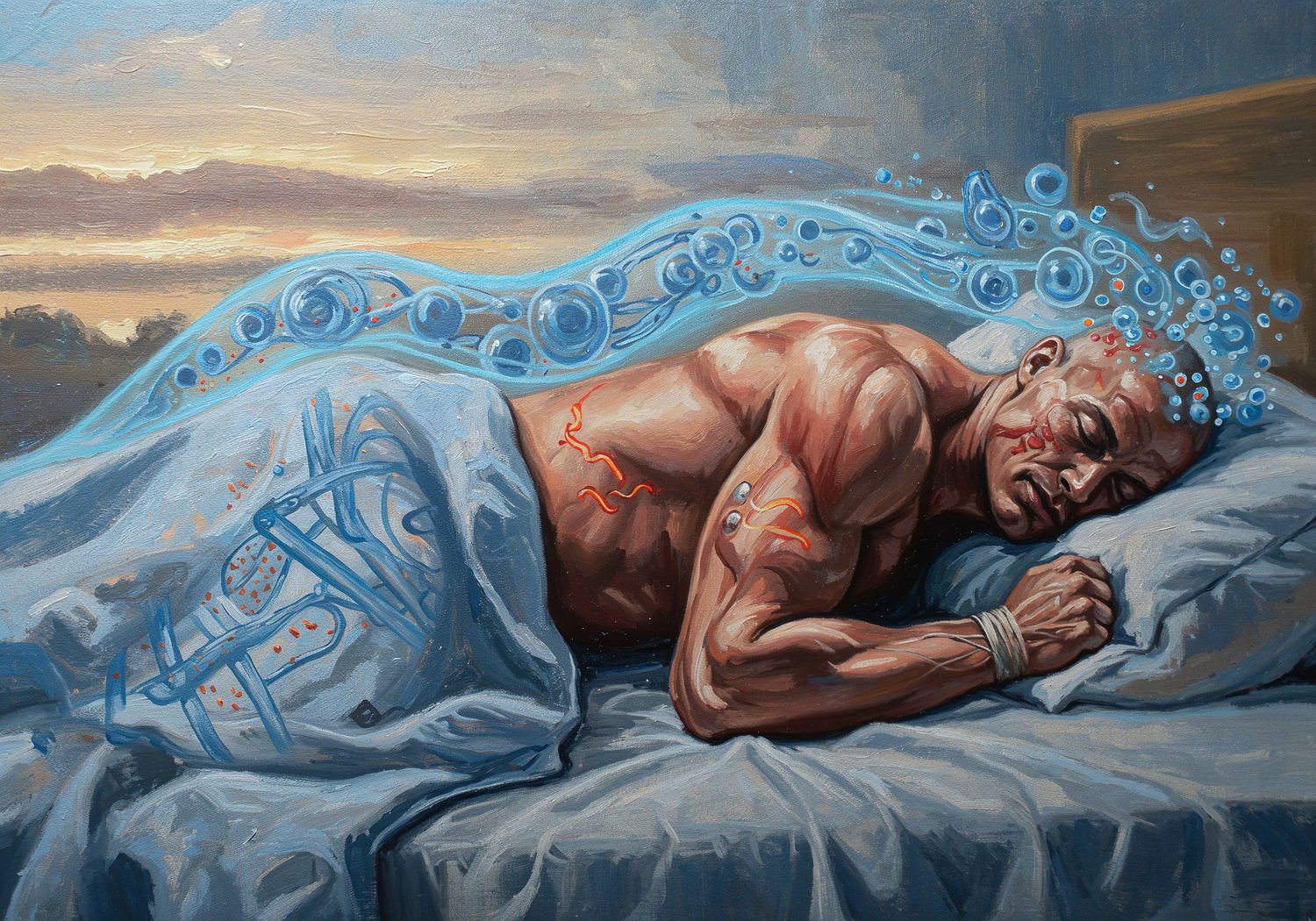 Impressionist painting, plein air, vibrant colors, capturing the moment, flickering light, visible short brush strokes, broken color technique, soft focus Impressionist painting, plein air, vibrant colors, capturing the moment, flickering light, visible short brush strokes, broken color technique, soft focus A muscular athlete lying in bed in deep sleep, with ethereal waves of blue delta brain waves emanating from their head, surrounding their body as microscopic scenes show muscle fibers repairing and growing, growth hormone molecules pulsing from the pituitary gland to the muscles, and a faint overlay of a weightlifting session fading into restorative rest. ;Image without icons or texts. Style: Oil painting on canvas, impasto texture, thick layers of paint, high-key lighting, atmosphere of a hazy morning; ;Image without icons or texts. Style: Oil painting on canvas, impasto texture, thick layers of paint, high-key lighting, atmosphere of a hazy morning;