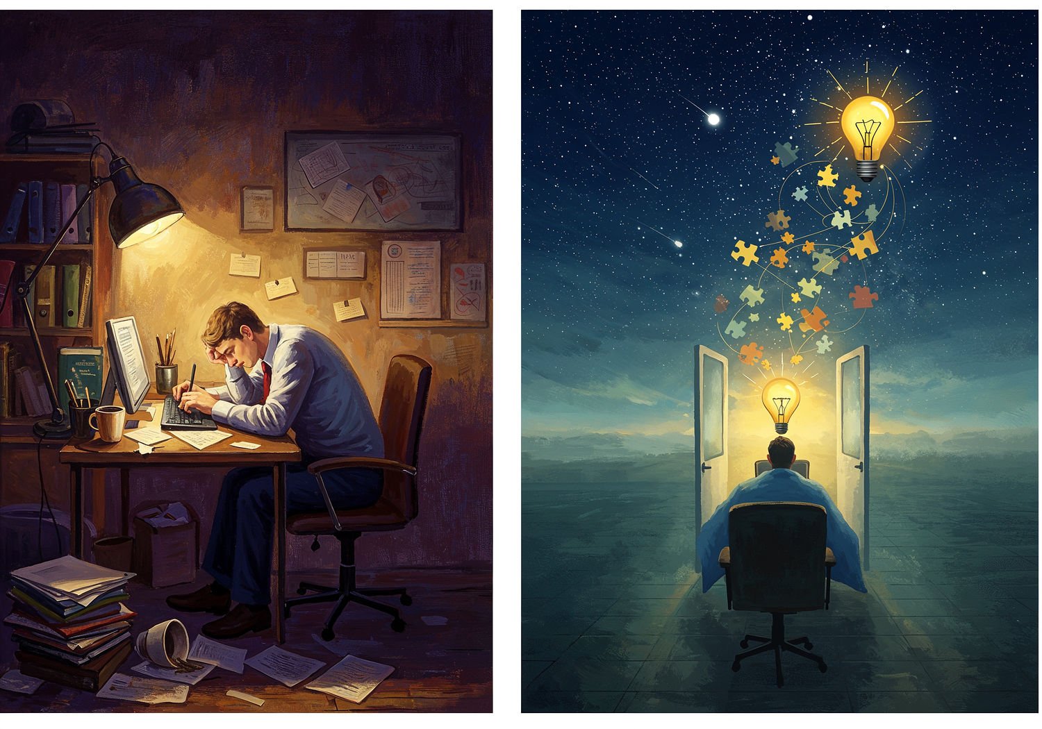 Impressionist painting, plein air, vibrant colors, capturing the moment, flickering light, visible short brush strokes, broken color technique, soft focus Impressionist painting, plein air, vibrant colors, capturing the moment, flickering light, visible short brush strokes, broken color technique, soft focus A split-scene illustration showing on one side a exhausted office worker slumped over a desk with multiple empty coffee cups, struggling with paperwork and a dim lightbulb above their head, and on the other side a refreshed worker rising from a cozy bed under a starry night sky, entering a bright office with flowing ideas visualized as connecting neural pathways, solved puzzles, and a vibrant lightbulb, symbolizing enhanced productivity, creativity, memory consolidation, and positive mood from proper sleep. ;Image without icons or texts. Style: Oil painting on canvas, impasto texture, thick layers of paint, high-key lighting, atmosphere of a hazy morning; ;Image without icons or texts. Style: Oil painting on canvas, impasto texture, thick layers of paint, high-key lighting, atmosphere of a hazy morning;