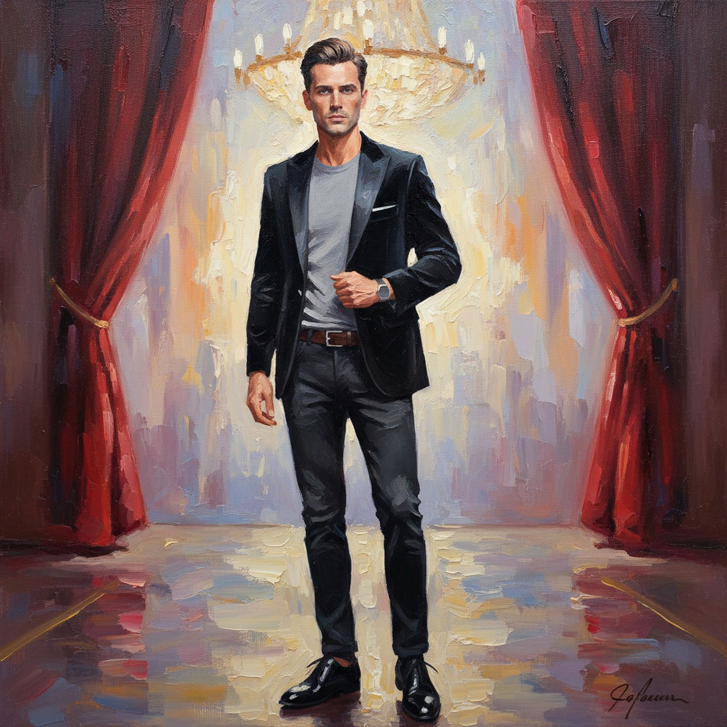 Impressionist painting, plein air, vibrant colors, capturing the moment, flickering light, visible short brush strokes, broken color technique, soft focus Impressionist painting, plein air, vibrant colors, capturing the moment, flickering light, visible short brush strokes, broken color technique, soft focus A man standing confidently in a theater foyer, wearing a black blazer with shiny velvet lapels, a plain gray t-shirt tucked in, slim dark pants, brown leather belt, black derby shoes, and a minimalist metal watch on his wrist, with neatly styled hair, surrounded by subtle theater elements like red curtains and a chandelier in the background. ;Image without icons or texts. Style: Oil painting on canvas, impasto texture, thick layers of paint, high-key lighting, atmosphere of a hazy morning; ;Image without icons or texts. Style: Oil painting on canvas, impasto texture, thick layers of paint, high-key lighting, atmosphere of a hazy morning;