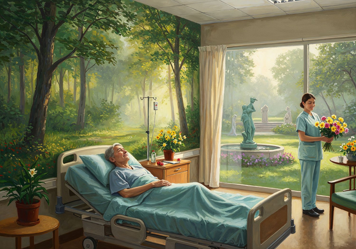Impressionist painting, plein air, vibrant colors, capturing the moment, flickering light, visible short brush strokes, broken color technique, soft focus Impressionist painting, plein air, vibrant colors, capturing the moment, flickering light, visible short brush strokes, broken color technique, soft focus A serene hospital room where a patient lies comfortably in bed, smiling while gazing at a large wall mural depicting a lush forest with sunlight filtering through trees, surrounded by potted green plants on windowsills and soft natural light streaming in from large windows overlooking a garden with therapeutic sculptures and a fountain, with a nurse nearby arranging fresh flowers, evoking a sense of calm and recovery. ;Image without icons or texts. Style: Oil painting on canvas, impasto texture, thick layers of paint, high-key lighting, atmosphere of a hazy morning; ;Image without icons or texts. Style: Oil painting on canvas, impasto texture, thick layers of paint, high-key lighting, atmosphere of a hazy morning;