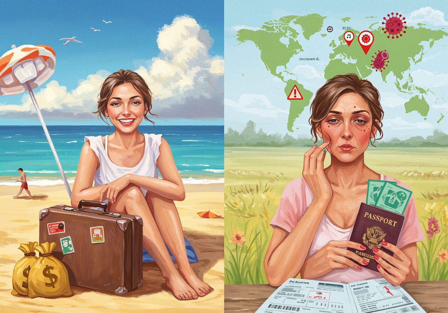 Impressionist painting, plein air, vibrant colors, capturing the moment, flickering light, visible short brush strokes, broken color technique, soft focus Impressionist painting, plein air, vibrant colors, capturing the moment, flickering light, visible short brush strokes, broken color technique, soft focus A split-scene illustration showing a smiling middle-aged woman on the left side relaxing on a sunny beach in Poland after a dental procedure, with perfect white teeth and a vacation suitcase nearby, while on the right side the same woman experiences a complication like a swollen cheek from a botox injection in a Thai clinic, holding a passport and medical bill, with a world map background highlighting popular destinations like Hungary, India, and Mexico, and subtle icons of savings money bags versus risk warning symbols like infection bacteria and legal documents. ;Image without icons or texts. Style: Oil painting on canvas, impasto texture, thick layers of paint, high-key lighting, atmosphere of a hazy morning; ;Image without icons or texts. Style: Oil painting on canvas, impasto texture, thick layers of paint, high-key lighting, atmosphere of a hazy morning;