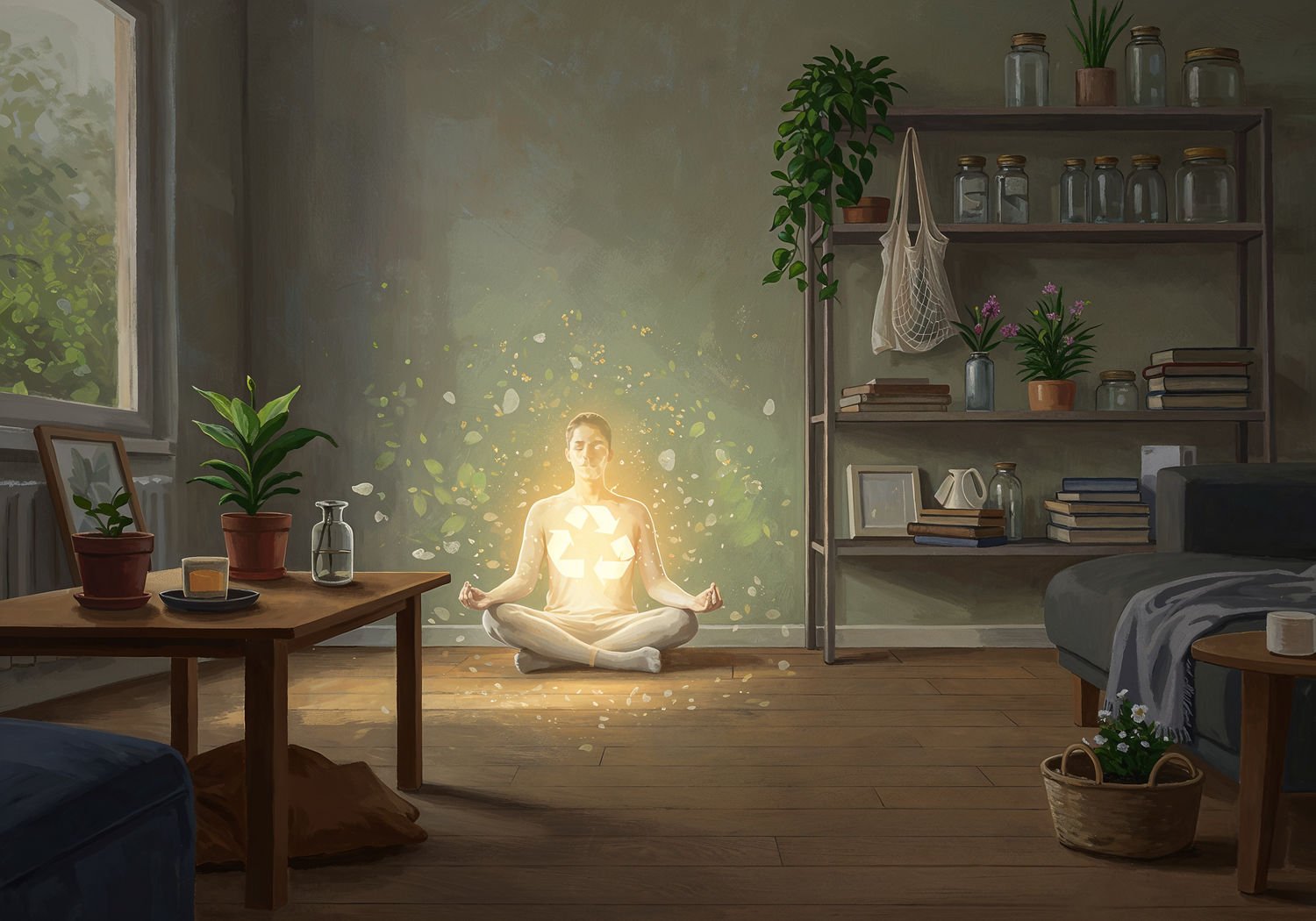 Impressionist painting, plein air, vibrant colors, capturing the moment, flickering light, visible short brush strokes, broken color technique, soft focus Impressionist painting, plein air, vibrant colors, capturing the moment, flickering light, visible short brush strokes, broken color technique, soft focus A serene minimalist living room with sparse, essential furniture like a simple wooden table, a single potted plant, and open shelves holding reusable glass jars and cloth bags; in the foreground, a calm person sits cross-legged on the floor meditating with a subtle glow of peace around them, while faint background shadows suggest discarded clutter transforming into recycling symbols and blooming greenery, symbolizing reduced stress and ecological harmony. ;Image without icons or texts. Style: Oil painting on canvas, impasto texture, thick layers of paint, high-key lighting, atmosphere of a hazy morning; ;Image without icons or texts. Style: Oil painting on canvas, impasto texture, thick layers of paint, high-key lighting, atmosphere of a hazy morning;