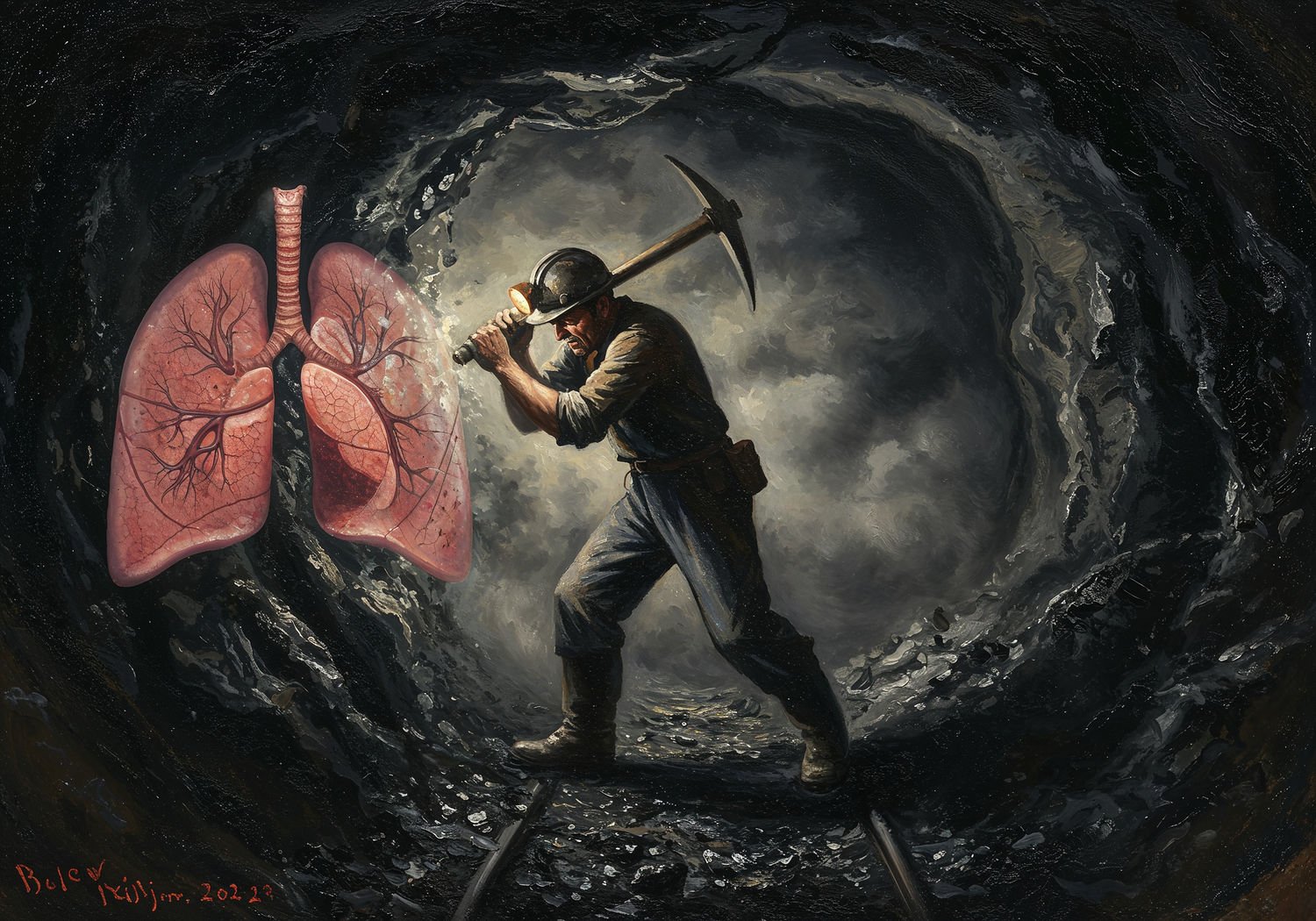 Impressionist painting, plein air, vibrant colors, capturing the moment, flickering light, visible short brush strokes, broken color technique, soft focus Impressionist painting, plein air, vibrant colors, capturing the moment, flickering light, visible short brush strokes, broken color technique, soft focus A weary coal miner in a dark underground tunnel, swinging a pickaxe against rock walls releasing clouds of black and gray dust particles into the air, with the miner coughing and clutching his chest, while in the foreground a translucent overlay shows his lungs scarred and filled with mineral deposits, symbolizing silicosis and anthracosis. ;Image without icons or texts. Style: Oil painting on canvas, impasto texture, thick layers of paint, high-key lighting, atmosphere of a hazy morning; ;Image without icons or texts. Style: Oil painting on canvas, impasto texture, thick layers of paint, high-key lighting, atmosphere of a hazy morning;