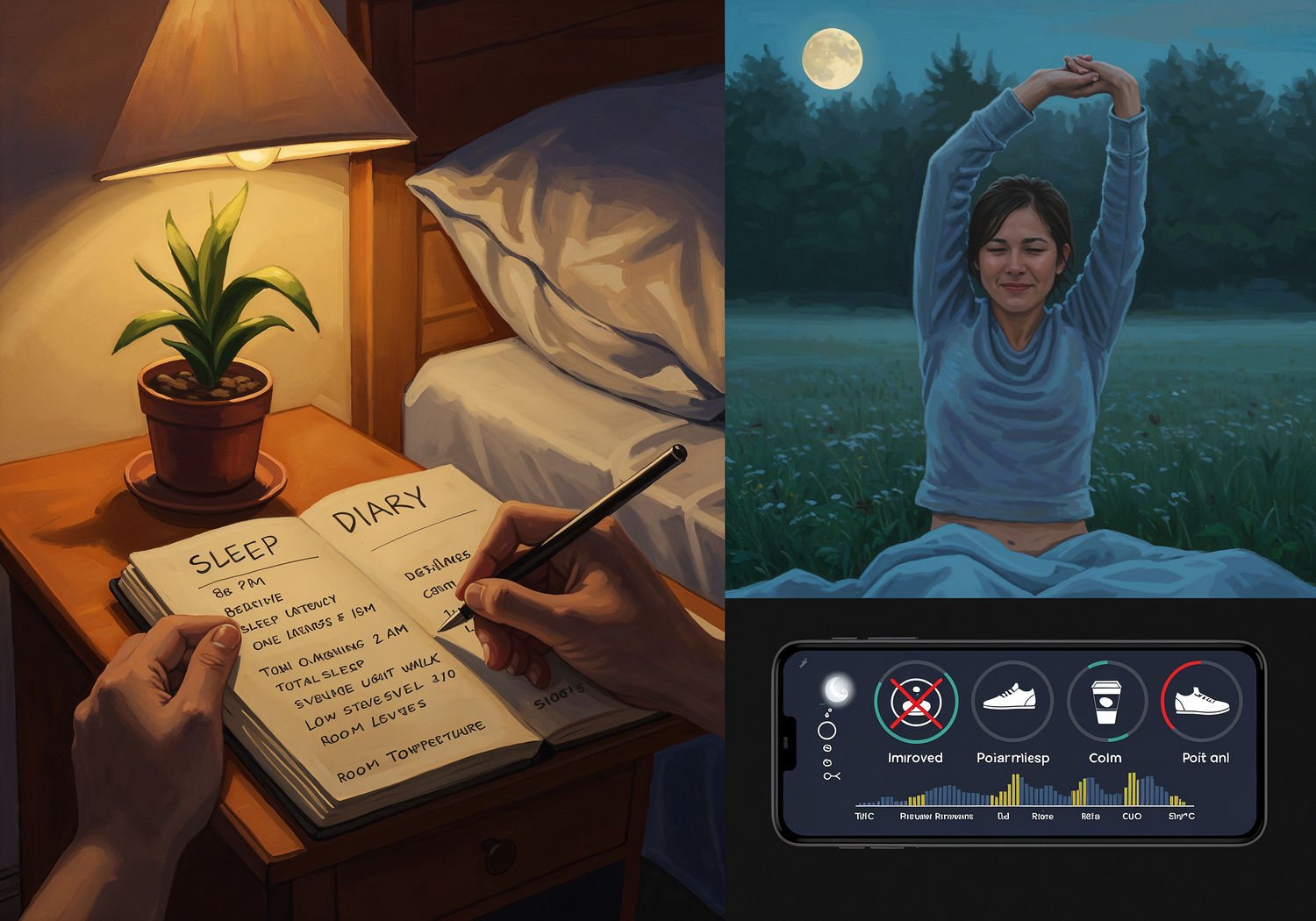 Impressionist painting, plein air, vibrant colors, capturing the moment, flickering light, visible short brush strokes, broken color technique, soft focus Impressionist painting, plein air, vibrant colors, capturing the moment, flickering light, visible short brush strokes, broken color technique, soft focus A person sitting at a bedside table in a dimly lit bedroom, writing in an open notebook labeled „Sleep Diary,” with entries noting bedtime at 11 PM, sleep latency of 15 minutes, one awakening at 2 AM, total sleep 7 hours, evening meal of light dinner, 30-minute walk, low stress level 3/10, room temperature 18°C; beside the notebook, a smartphone app displays a sleep graph showing improved REM and deep sleep phases, icons of a coffee cup crossed out, running shoes, and a calm moon in the background, transitioning to the same person waking up refreshed with a smile, stretching energetically in morning light. ;Image without icons or texts. Style: Oil painting on canvas, impasto texture, thick layers of paint, high-key lighting, atmosphere of a hazy morning; ;Image without icons or texts. Style: Oil painting on canvas, impasto texture, thick layers of paint, high-key lighting, atmosphere of a hazy morning;