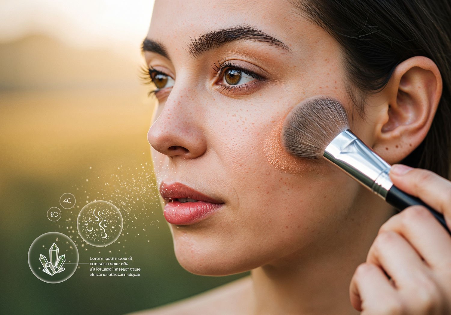 Impressionist painting, plein air, vibrant colors, capturing the moment, flickering light, visible short brush strokes, broken color technique, soft focus Impressionist painting, plein air, vibrant colors, capturing the moment, flickering light, visible short brush strokes, broken color technique, soft focus A close-up view of a woman’s face with sensitive, acne-prone skin, gently applying mineral powder using a kabuki brush, with sparkling particles of zinc oxide and titanium dioxide forming a protective, reflective barrier on her skin that deflects UV rays, while natural minerals like mica and iron oxides blend seamlessly to even out tone and reduce redness, surrounded by subtle icons of earth-derived crystals and a healthy, breathing pore structure. ;Image without icons or texts. Style: Oil painting on canvas, impasto texture, thick layers of paint, high-key lighting, atmosphere of a hazy morning; ;Image without icons or texts. Style: Oil painting on canvas, impasto texture, thick layers of paint, high-key lighting, atmosphere of a hazy morning;