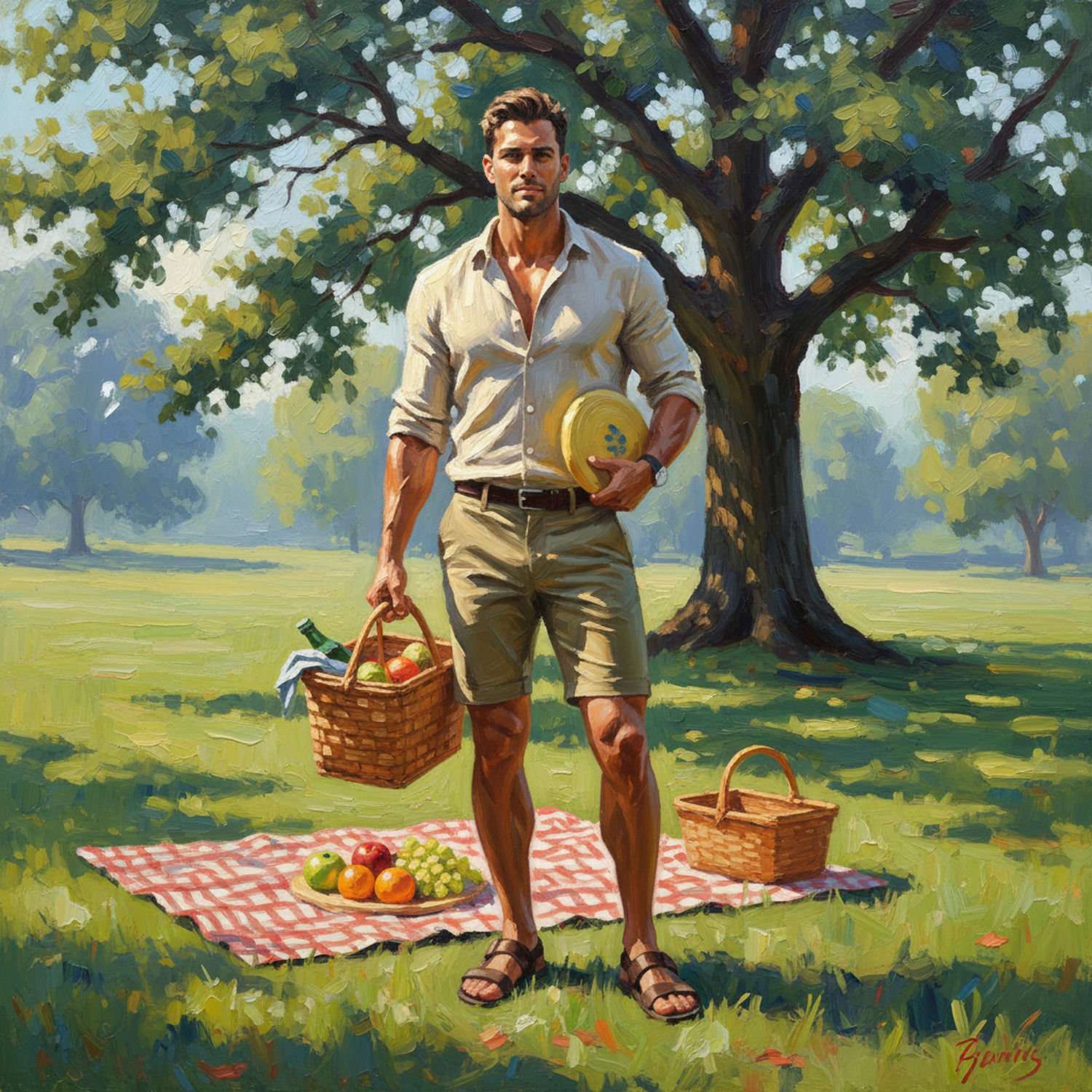 Impressionist painting, plein air, vibrant colors, capturing the moment, flickering light, visible short brush strokes, broken color technique, soft focus Impressionist painting, plein air, vibrant colors, capturing the moment, flickering light, visible short brush strokes, broken color technique, soft focus A fit athletic man in his 30s with tanned skin, broad shoulders, and muscular build, standing confidently on a sunny grassy picnic area, wearing a slim-fit beige linen shirt with sleeves rolled up and top buttons undone, paired with khaki slim-fit shorts ending above the knee, and brown minimalist leather sandals with adjustable straps. He holds a picnic basket in one hand and a frisbee in the other, with a checkered blanket, fresh fruits, and a wicker basket spread out nearby under a large oak tree, evoking a relaxed summer outdoor vibe. ;Image without icons or texts. Style: Oil painting on canvas, impasto texture, thick layers of paint, high-key lighting, atmosphere of a hazy morning; ;Image without icons or texts. Style: Oil painting on canvas, impasto texture, thick layers of paint, high-key lighting, atmosphere of a hazy morning;