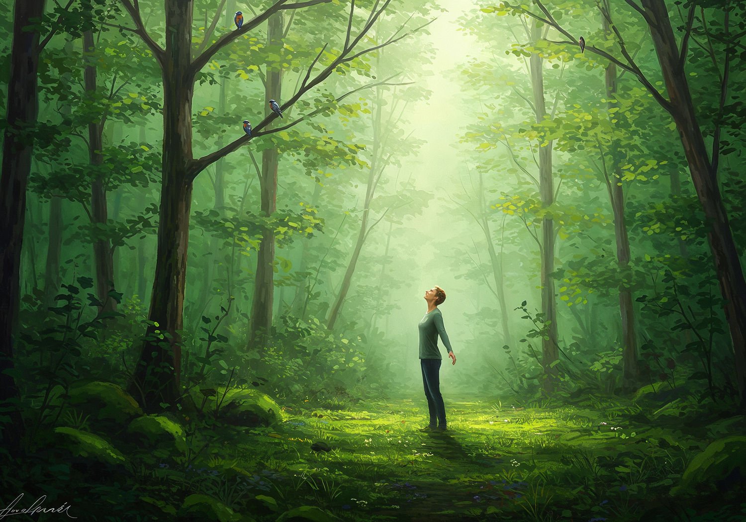 Impressionist painting, plein air, vibrant colors, capturing the moment, flickering light, visible short brush strokes, broken color technique, soft focus Impressionist painting, plein air, vibrant colors, capturing the moment, flickering light, visible short brush strokes, broken color technique, soft focus A person standing calmly in a dense, lush forest, eyes closed in relaxation, arms slightly outstretched as if breathing deeply the fresh air filled with mist from surrounding trees, sunlight filtering through green canopy onto mossy ground, birds perched on branches nearby, evoking a sense of immersion and healing connection with nature. ;Image without icons or texts. Style: Oil painting on canvas, impasto texture, thick layers of paint, high-key lighting, atmosphere of a hazy morning; ;Image without icons or texts. Style: Oil painting on canvas, impasto texture, thick layers of paint, high-key lighting, atmosphere of a hazy morning;